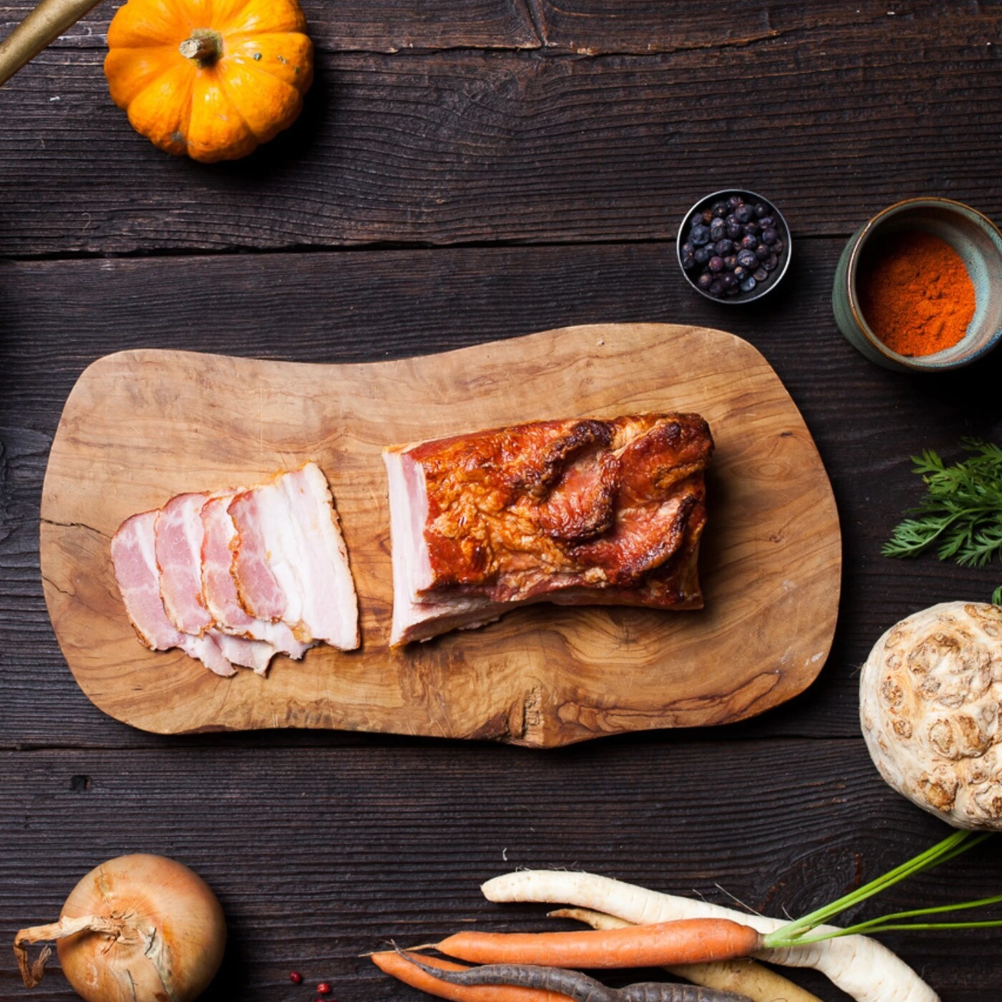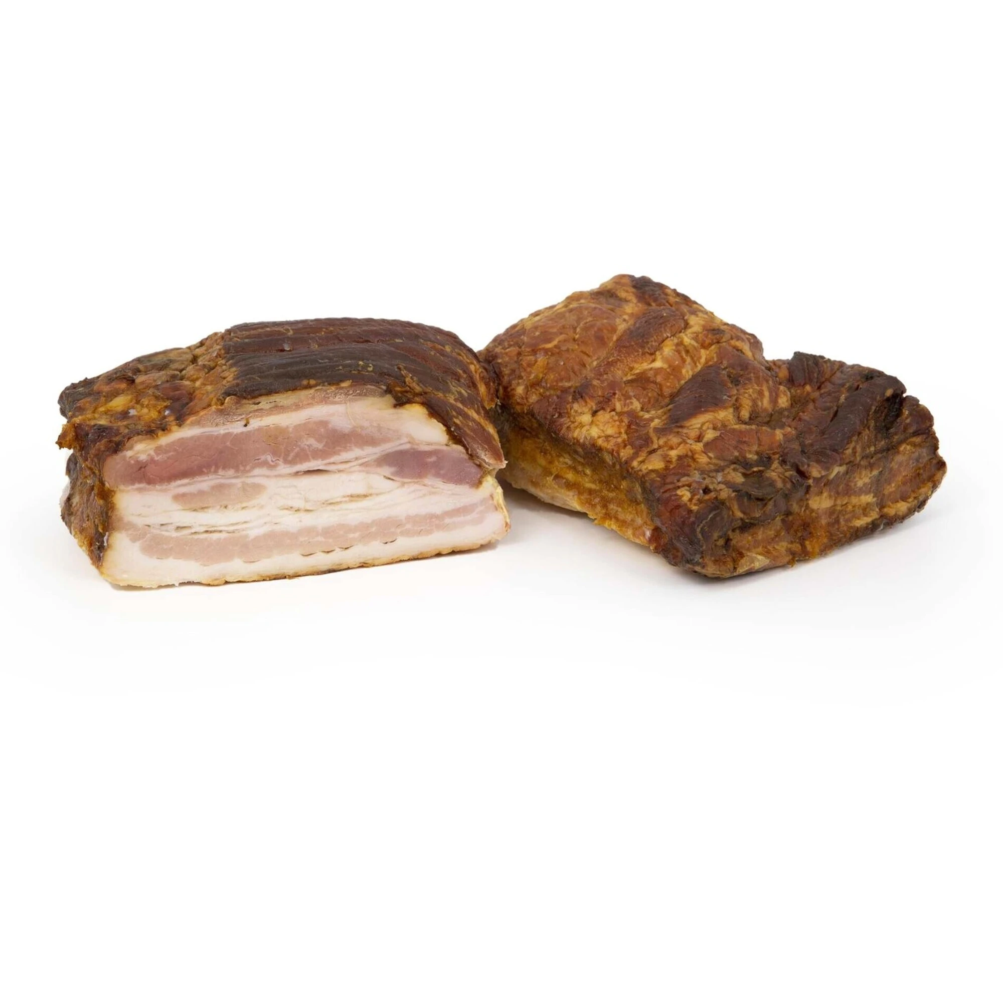 Boczek pieczony to aromatyczna, soczysta wędlina przygotowana z wysokiej jakości mięsa wieprzowego, starannie przyprawiona i pieczona do złocistej perfekcji. Zachwyca intensywnym smakiem, chrupiącą skórką i naturalnym aromatem ziół i przypraw. Idealny na ciepło do obiadu, jak i na zimno – do kanapek czy jako dodatek do deski wędlin.