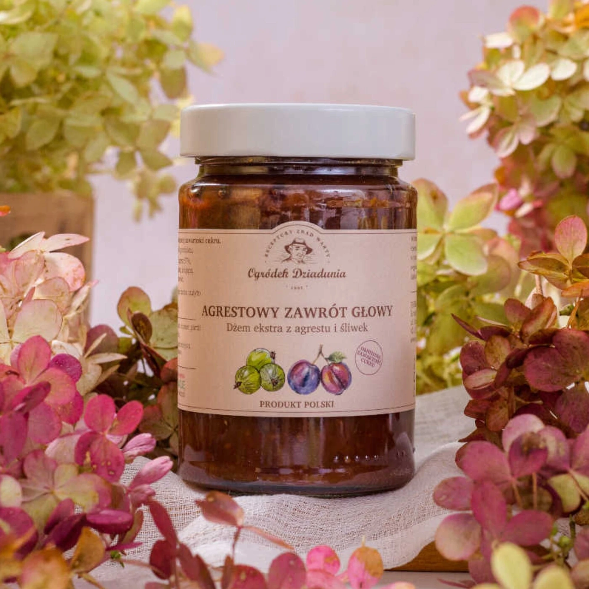 Dżem agrestowo-śliwkowy - Agrestowy Zawrót Głowy połączenie agrestu i śliwek w lekkim w naturalnym wydaniu! Dżem to kwintesencja owocowego smaku – kwaśność agrestu idealnie współgra ze słodyczą dojrzałych śliwek, tworząc harmonijną kompozycję, której trudno się oprzeć. Dzięki obniżonej zawartości cukru możesz delektować się nim bez wyrzutów sumienia, a wysoka zawartość owoców sprawia, że każdy kęs smakuje jak świeżo zerwane owoce z sadu. Jego aksamitna konsystencja sprawia, że świetnie rozprowadza się na pieczywie, intensywny smak doskonale podkreśli smak naleśników, gofrów czy jogurtu. To także doskonały dodatek do serów i mięs – subtelna słodycz i owocowa głębia wprowadzą nowe doznania do Twojej kuchni.