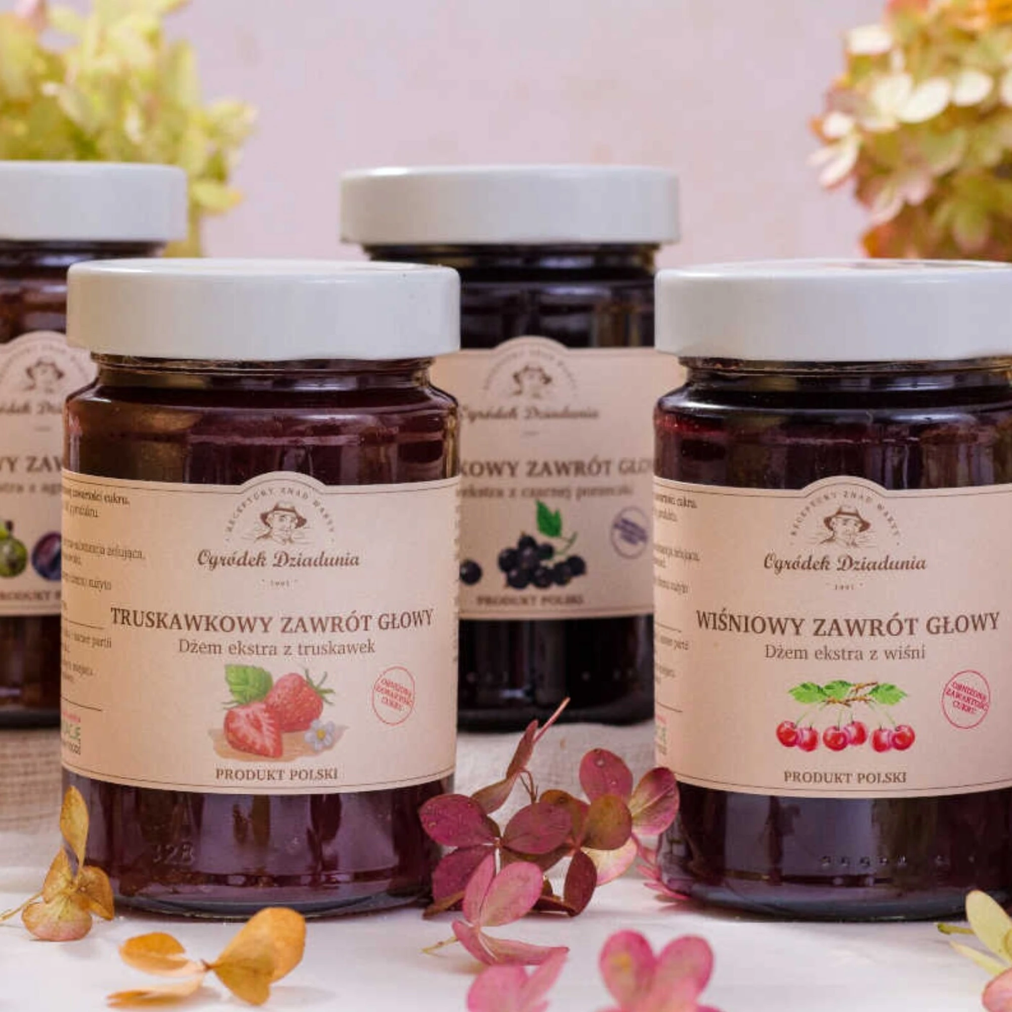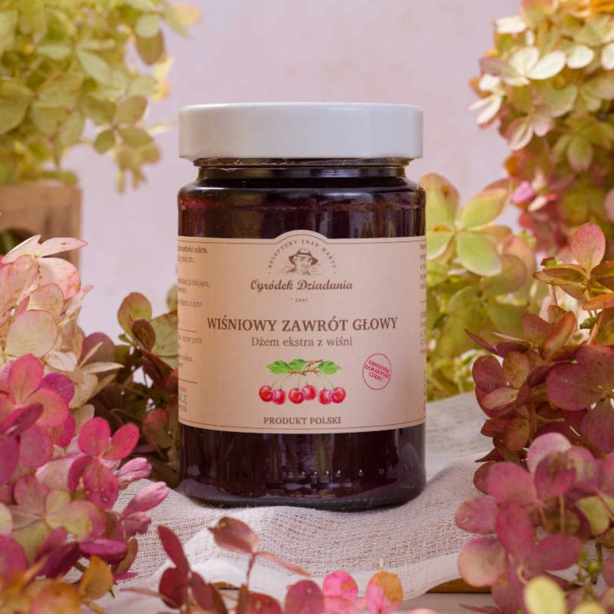 Dżem wiśniowy - Wiśniowy Zawrót Głowy zawiera dużą ilość owoców i mniejszą ilość cukru, dzięki czemu możesz cieszyć się jego smakiem bez wyrzutów sumienia. To doskonały wybór dla tych, którzy cenią tradycyjne smaki, ale zwracają uwagę na jakość i zdrowy styl życia. Dżem doskonały na świeże pieczywo, chałkę, naleśniki i gofry. Jako dodatek do mięs i serów – świetnie komponuje się z serami pleśniowymi i pieczonym drobiem.Słoiczek pełen naturalnego dżemu wiśniowego to świetny upominek dla miłośników domowych smaków. Podaruj bliskim coś wyjątkowego – smak tradycji zamknięty w słoiczku.