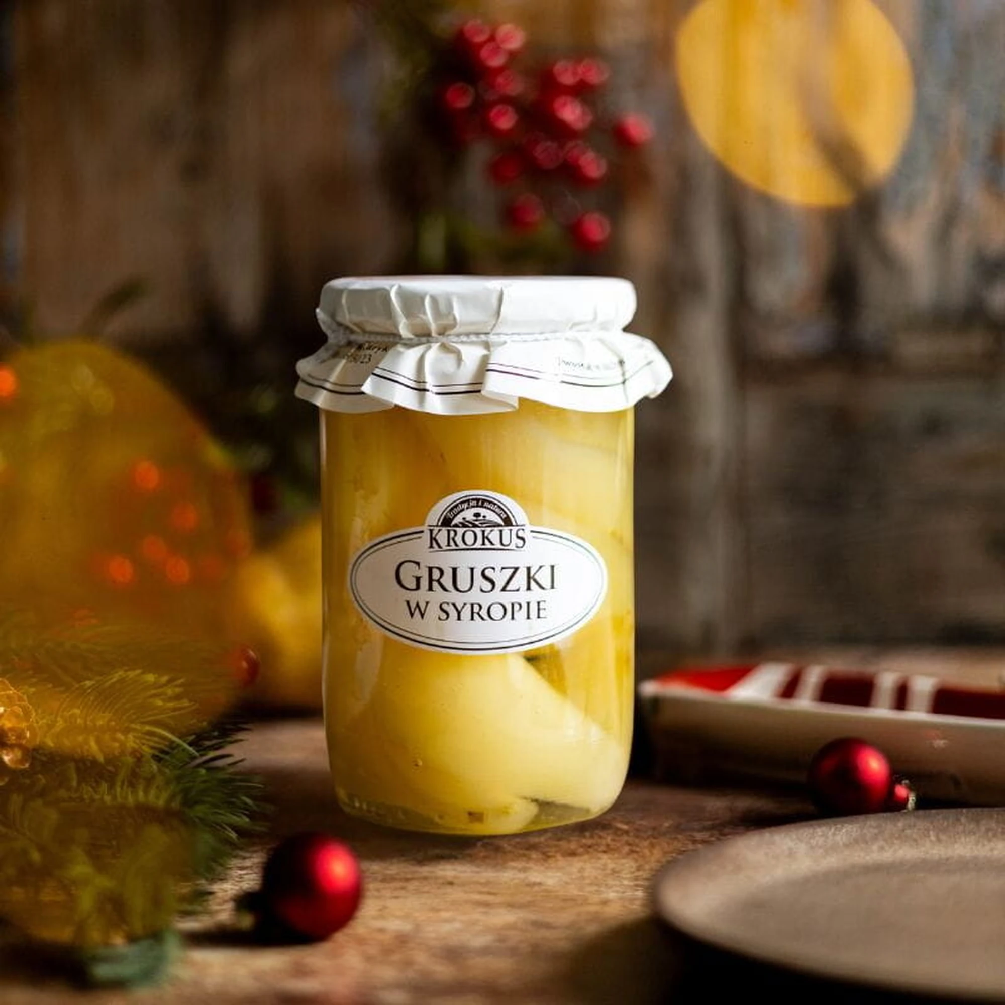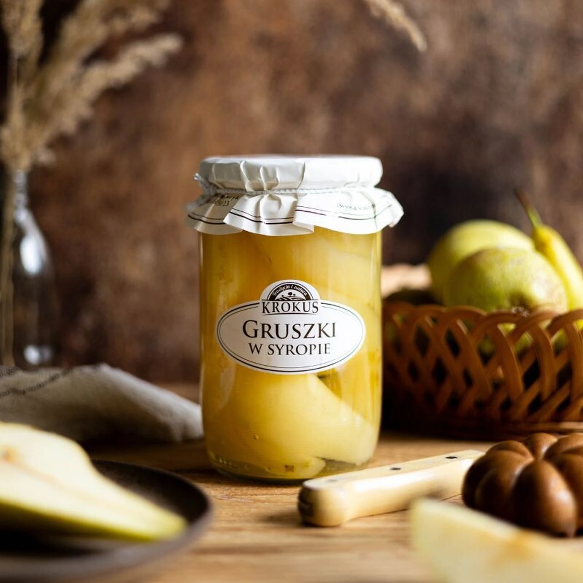 Gruszki w syropie to tradycyjny przetwór, w którym dojrzałe, ekologiczne gruszki marynowane są w naturalnym syropie przygotowanym według sprawdzonej receptury. Naturalna słodycz gruszek idealnie współgra z aksamitnym, gęstym syropem, tworząc wyjątkowy smak, który przypomina domowe wypieki i tradycyjne przetwory. Produkt zachwyca intensywnym aromatem i subtelną konsystencją, co sprawia, że doskonale sprawdza się jako dodatek do deserów, naleśników, lodów czy jogurtów. Gruszki w syropie można podawać na zimno lub lekko podgrzane, jako samodzielny przysmak lub element bardziej złożonych kompozycji kulinarnych. Mogą stanowić składnik pizzy i dań z kurczakiem. W połączeniu z papryką chili i czekoladą tworzą niecodzienny deser. Wybierając ten produkt, sięgasz po naturalną żywność wolną od sztucznych dodatków, która wzbogaca codzienne posiłki o nutę tradycyjnego smaku i zdrowotnych właściwości owoców.