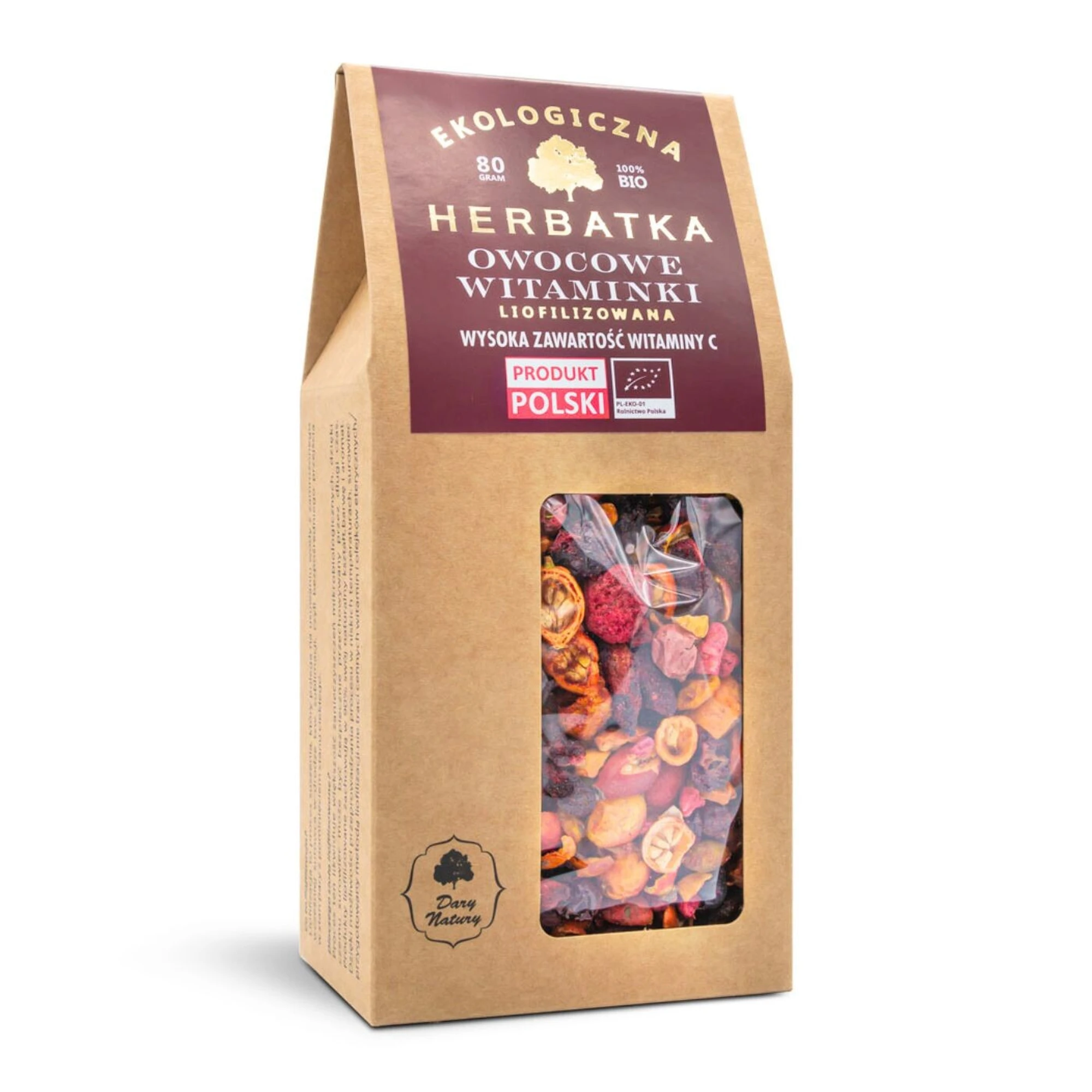 Herbatka liofilizowana owocowe witaminki to naturalny napar bogaty w witaminy i antyoksydanty, które wspierają odporność i ogólne dobre samopoczucie. Zawiera certyfikowane ekologiczne owoce, takie jak dzika róża, malina, jagoda kamczacka, borówka wysoka, rokitnik, żurawina oraz pigwowiec, które są źródłem witaminy C, witamin z grupy B oraz cennych składników mineralnych. Regularne spożywanie tej herbatki wspomaga układ odpornościowy, poprawia kondycję skóry i działa przeciwstarzeniowo dzięki zawartości antyoksydantów. Można ją pić samą lub dodawać do herbaty, płynów dla urozmaicenia smaku, a także jako dodatek do deserów i jogurtów. Jej delikatny, owocowy smak sprawia, że jest idealnym wyborem na co dzień, zarówno dla dzieci, jak i dorosłych. To naturalne źródło witamin i składników odżywczych, które można łatwo wprowadzić do codziennej diety.