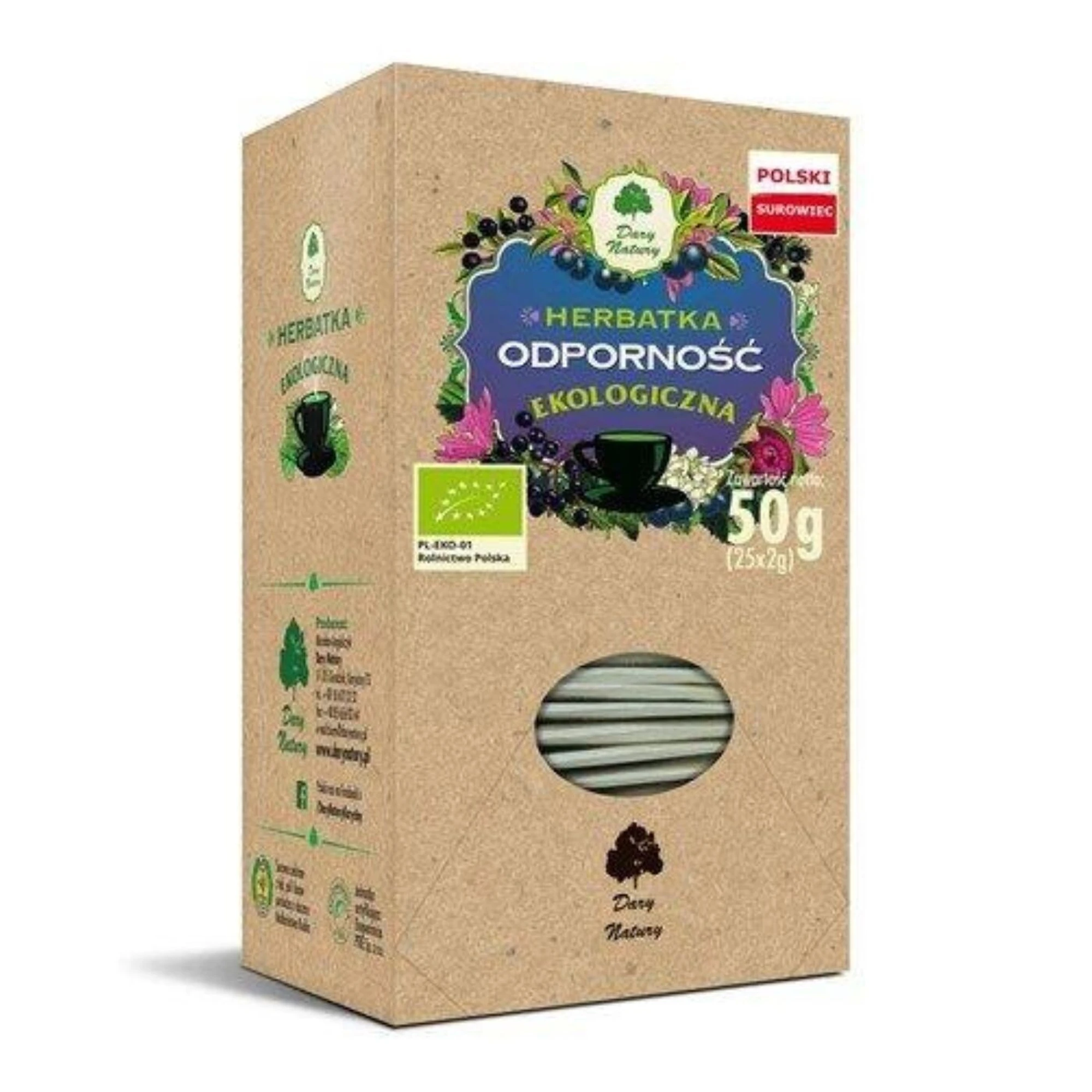 Herbatka uodparniająca Bio to naturalny napar o bogatym składzie z certyfikowanych ekologicznych składników, takich jak owoce tarniny i bzu, ziele krwawnika, tawuły, jeżówki, kora wierzby oraz kwiat ślazu. Te zioła zawierają cenne witaminy, m.in. witaminę C, która wspiera układ odpornościowy, oraz flawonoidy i antyoksydanty, pomagające chronić organizm przed szkodliwym działaniem wolnych rodników. Wartości odżywcze herbatki wspomagają ogólne zdrowie, poprawiają samopoczucie i wzmacniają naturalną odporność ciała. Napar można pić samodzielnie lub jako dodatek do miodu, cytryny czy innych naturalnych składników, co potęguje jego korzystne działanie. Herbatka jest idealna do spożycia na co dzień, szczególnie w okresach zwiększonego ryzyka infekcji, wspierając organizm od środka. To doskonała propozycja dla osób ceniących naturalne metody wzmacniania zdrowia i odporności.