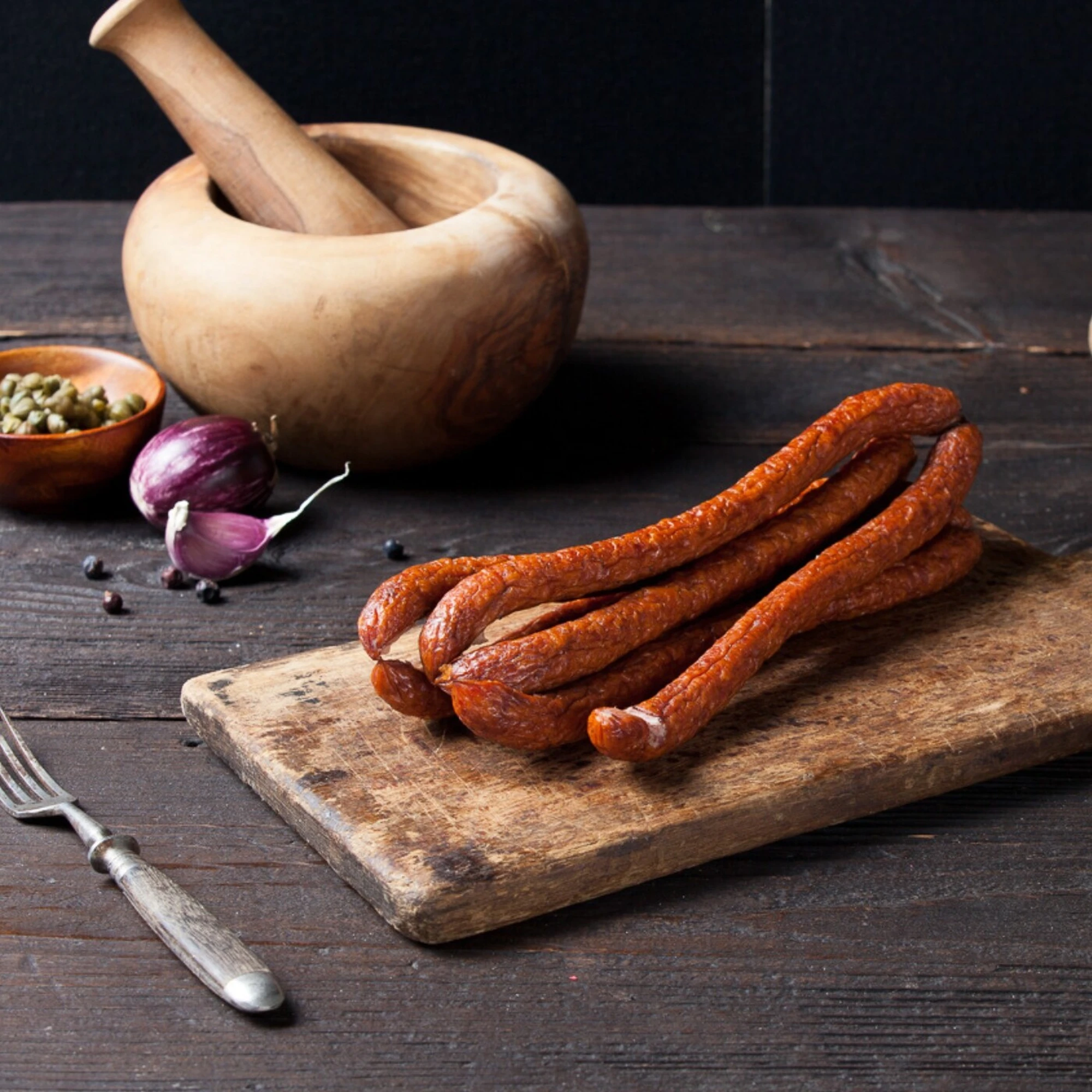 Wyjątkowo mięsne i aromatyczne kabanosy wędzone tradycyjnie. Doskonałe jako przekąska lub dodatek do deski wędlin.