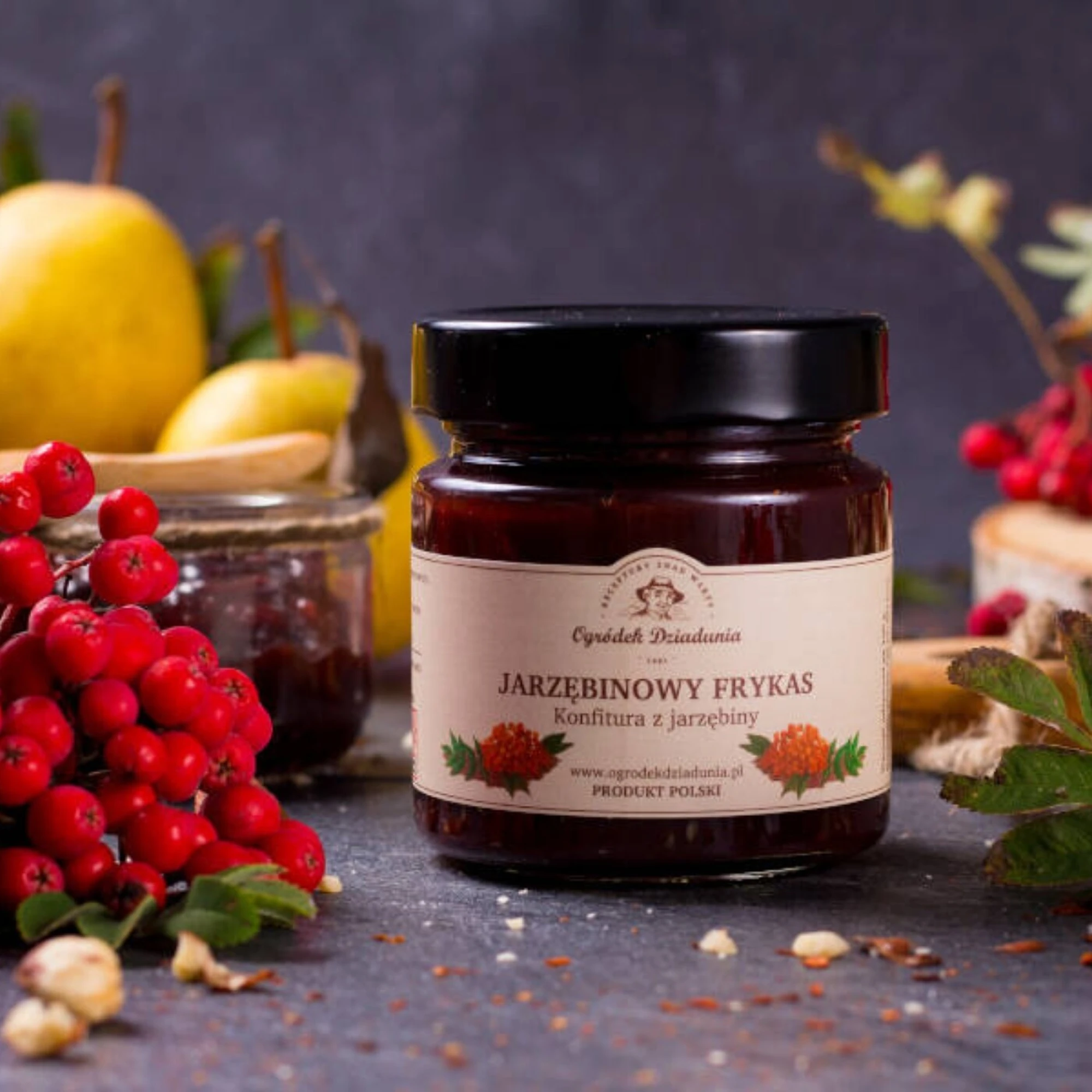 Konfitura z jarzębiny – Jarzębinowy Frykas to esencja prostoty i naturalności. Składa się wyłącznie z przemrożonych owoców jarzębiny, które dzięki temu procesowi tracą nadmiar goryczki, oraz cukru – nic więcej. Bez konserwantów, sztucznych barwników i ulepszaczy. Jarzębinowy Frykas to prawdziwy rarytas dla miłośników nietuzinkowych smaków. Doskonale komponuje się z pieczonym mięsem, podkreślając jego głębię i dodając elegancji każdemu posiłkowi. Świetnie sprawdzi się także jako dodatek do wędlin i serów, a jego wykwintny charakter nada nowy wymiar Twojej desce serów. Jeśli lubisz eksperymentować w kuchni, spróbuj dodać konfiturę do słodkich wypieków – jej delikatna gorycz przełamana słodyczą stworzy niepowtarzalne połączenie.