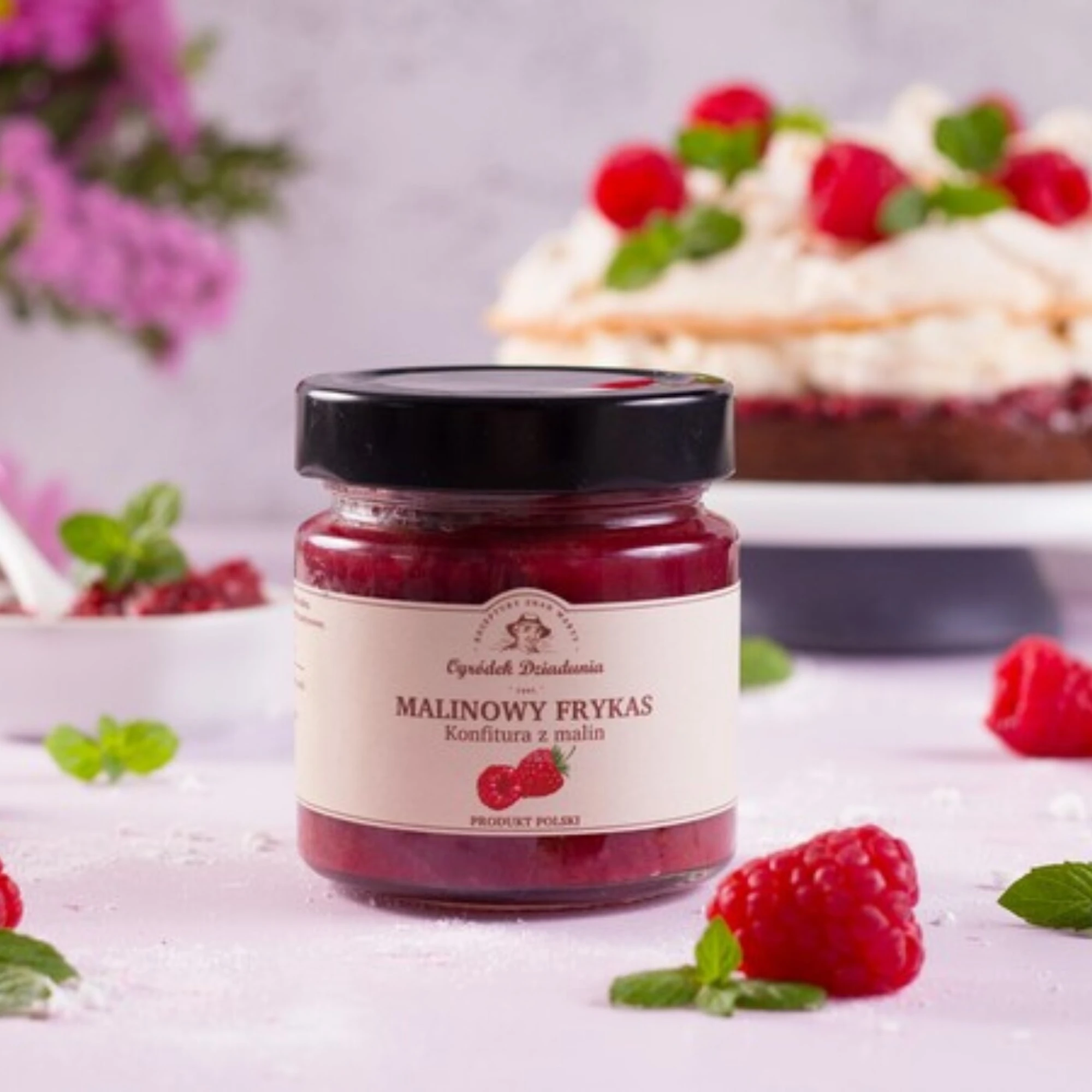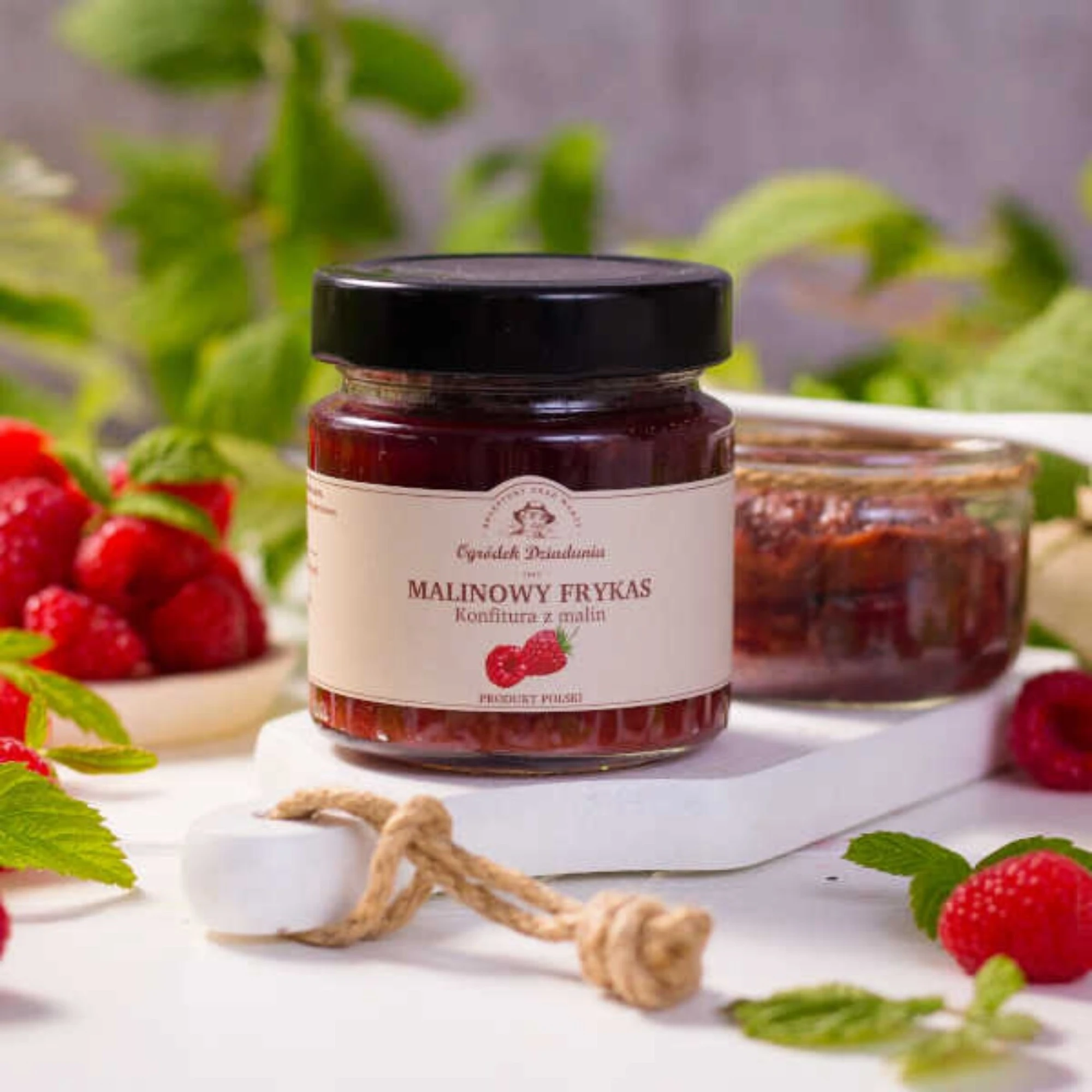 Konfitura z malin - Malinowy Frykas powstaje z soczystych, dojrzałych malin i niewielkiej ilości cukru, bez żadnych sztucznych dodatków. Bez konserwantów, barwników i wzmacniaczy smaku – tylko prosty, tradycyjny skład, który pozwala cieszyć się prawdziwym, owocowym smakiem. Konfitura z malin przygotowywana jest według domowej receptury, dzięki czemu smakuje jak przetwory robione przez babcię. To smak letnich dni zamknięty w słoiczku, pełen aromatu i słodyczy, z delikatnie wyczuwalną kwaskowatą nutą.