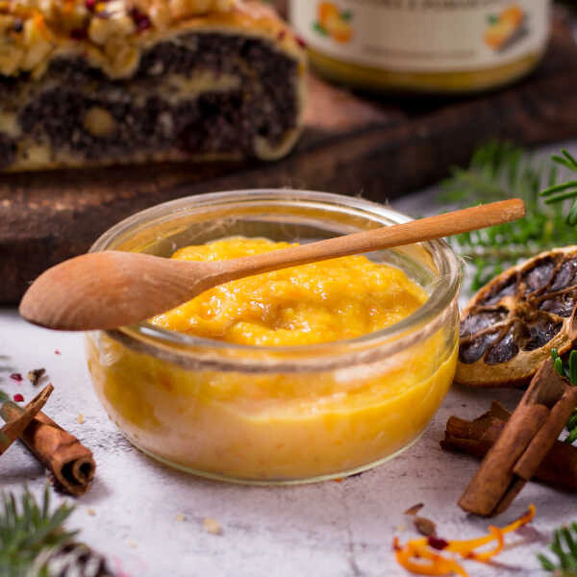 Konfitura z pomarańczy z dodatkiem cynamonu o obniżonej zawartośći cukru 42g na 100g produktu.