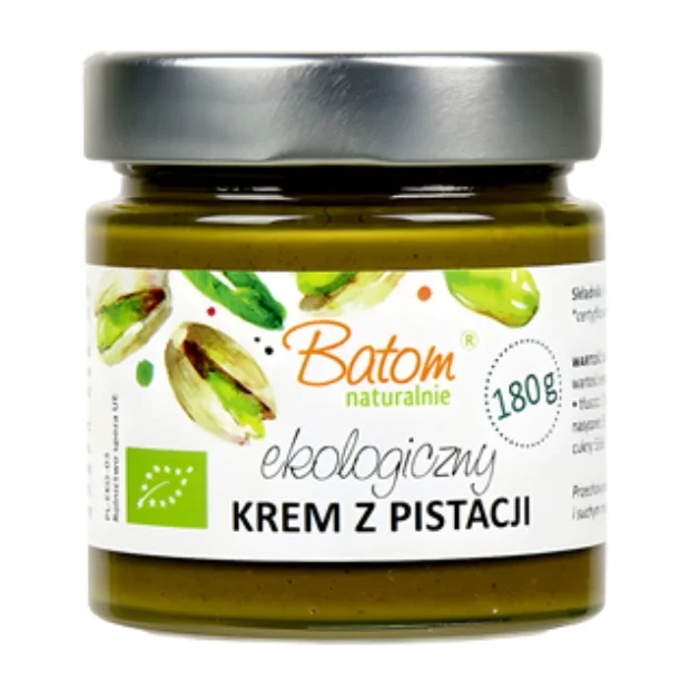 Krem z pistacji prażonych 100% Bio to naturalny i zdrowy dodatek, który wzbogaci każde danie i deser. Wykonany wyłącznie z ekologicznych, prażonych pistacji, nie zawiera sztucznych konserwantów ani dodatków. Doskonale sprawdzi się jako pasta do smarowania na pieczywo, dodatek do ciast, deserów czy smoothies, podkreślając ich wyjątkowy smak. Pistacje są źródłem cennych tłuszczów nienasyconych, białka, błonnika oraz witamin z grupy B, E i minerałów, takich jak magnez i potas. Krem z pistacji Bio jest idealny dla osób dbających o zdrową dietę i naturalne produkty. Dzięki prażeniu zachował intensywny aromat i chrupkość, co czyni go wyjątkowym składnikiem w kuchni.