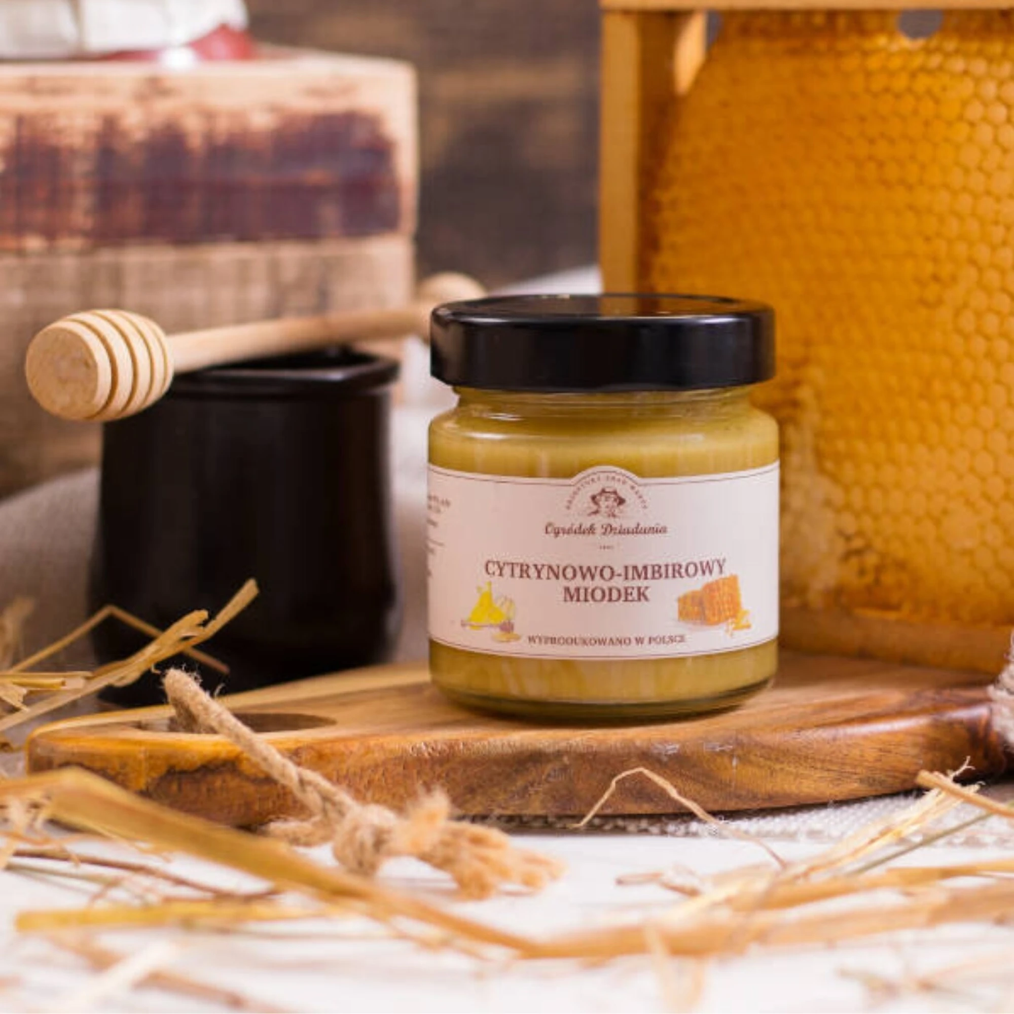 Miód wielokwiatowy z Imbirem i cytryną połączenie naturalnego miodu wielokwiatowego z aromatycznym imbirem i orzeźwiającą cytryną to prawdziwa uczta dla podniebienia i zdrowia. Bogaty w antyoksydanty, wspiera układ immunologiczny i trawienie. Imbirowo-cytrynowy miodek to idealny dodatek do napojów, deserów i domowych syropów. Rozgrzewający, pełen witamin i naturalnych składników wspierających odporność, sprawdzi się przez cały rok – zarówno w chłodne, jak i cieplejsze dni. Podkreśla smak potraw i nadaje im lekko pikantny aromat. Idealny do jogurtu, owsianki, tostów i naleśników. Nawilża skórę i działa antybakteryjnie.
