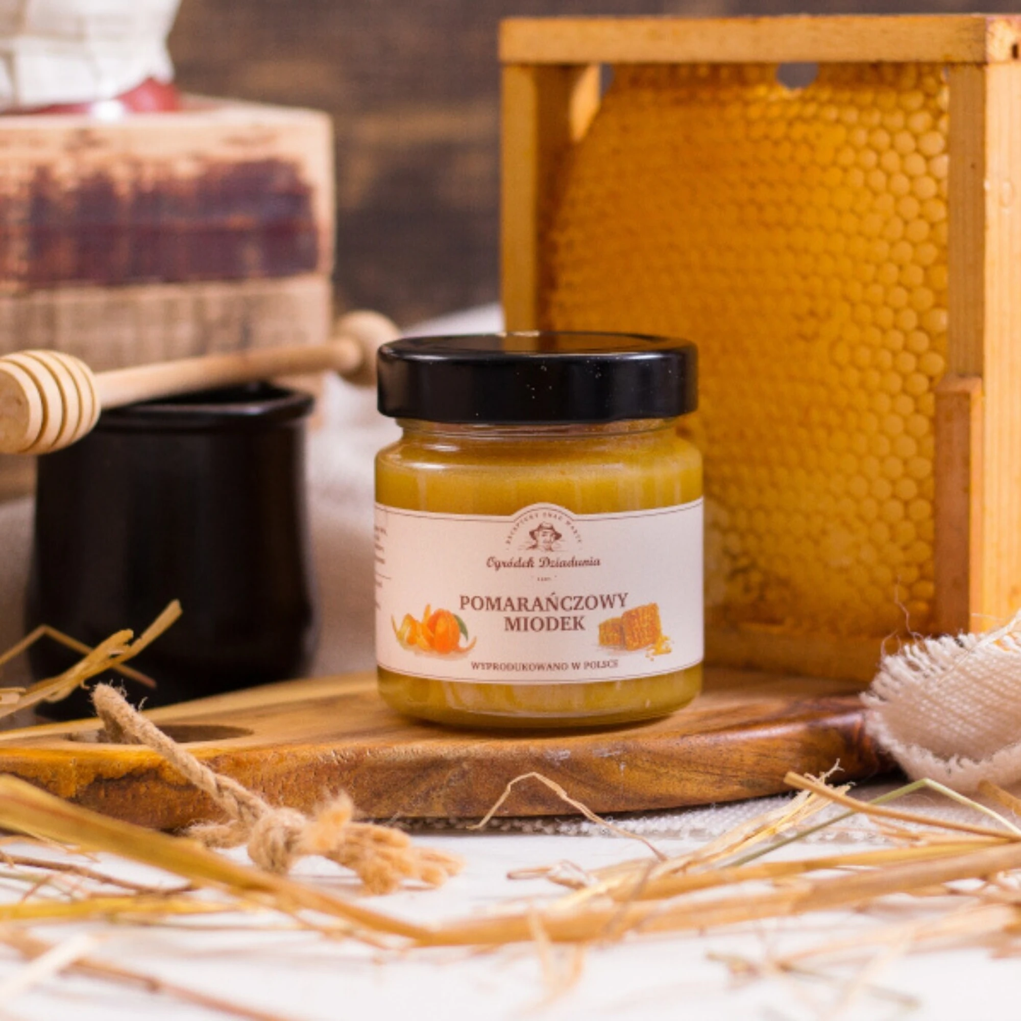 Miód wielokwiatowy z pomarańczą - Pomaranczowy miodek to połączenie naturalnego miodu wielokwiatowego z aromatyczną pomarańczą. To idealna propozycja dla miłośników cytrusowych smaków i naturalnych, zdrowych słodkości. Słodycz miodu przełamana delikatną nutą pomarańczy sprawia, że ten miodek jest nie tylko smaczny, ale i niezwykle aromatyczny. Pomarańcza dostarcza witamin, a miód działa wzmacniająco na organizm. 100% naturalnych składników bez konserwantów i barwników. Doskonały zamiast tradycyjnych smarowideł. Sprawia, że napoje zyskują wyjątkowy smak. Świetnie komponuje się z ciastami, jogurtami i lodami.