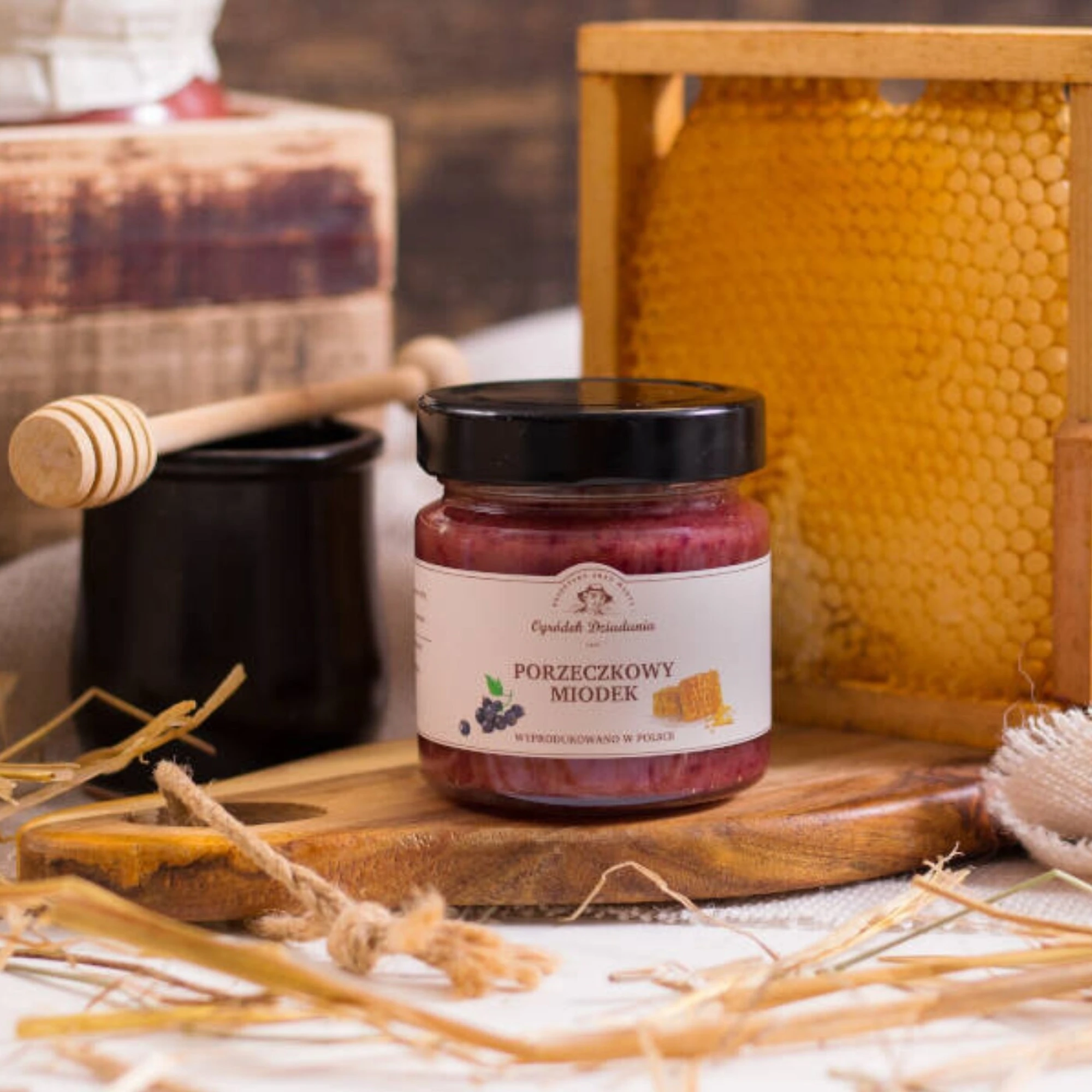 Miód wielokwiatowy z porzeczką - Porzeczkowy miodek to harmonijne połączenie miodu wielokwiatowego z aromatyczną, liofilizowaną porzeczką. Intensywny smak, piękny kolor i mnóstwo wartości odżywczych sprawiają, że to prawdziwa uczta dla podniebienia i zdrowia. Miód jest idealny na zmęczenie i spadek nastroju. Doskonała alternatywa dla cukru i sztucznych słodzików. Świetnie komponuje się z chlebem, bułeczkami i croissantami. Wzbogaca smak lodów, naleśników i owsianek. Może dodać ciekawego, owocowego akcentu do sałatek. Porzeczkowy Miodek to idealny prezent dla bliskich – na święta, urodziny czy inne wyjątkowe okazje.