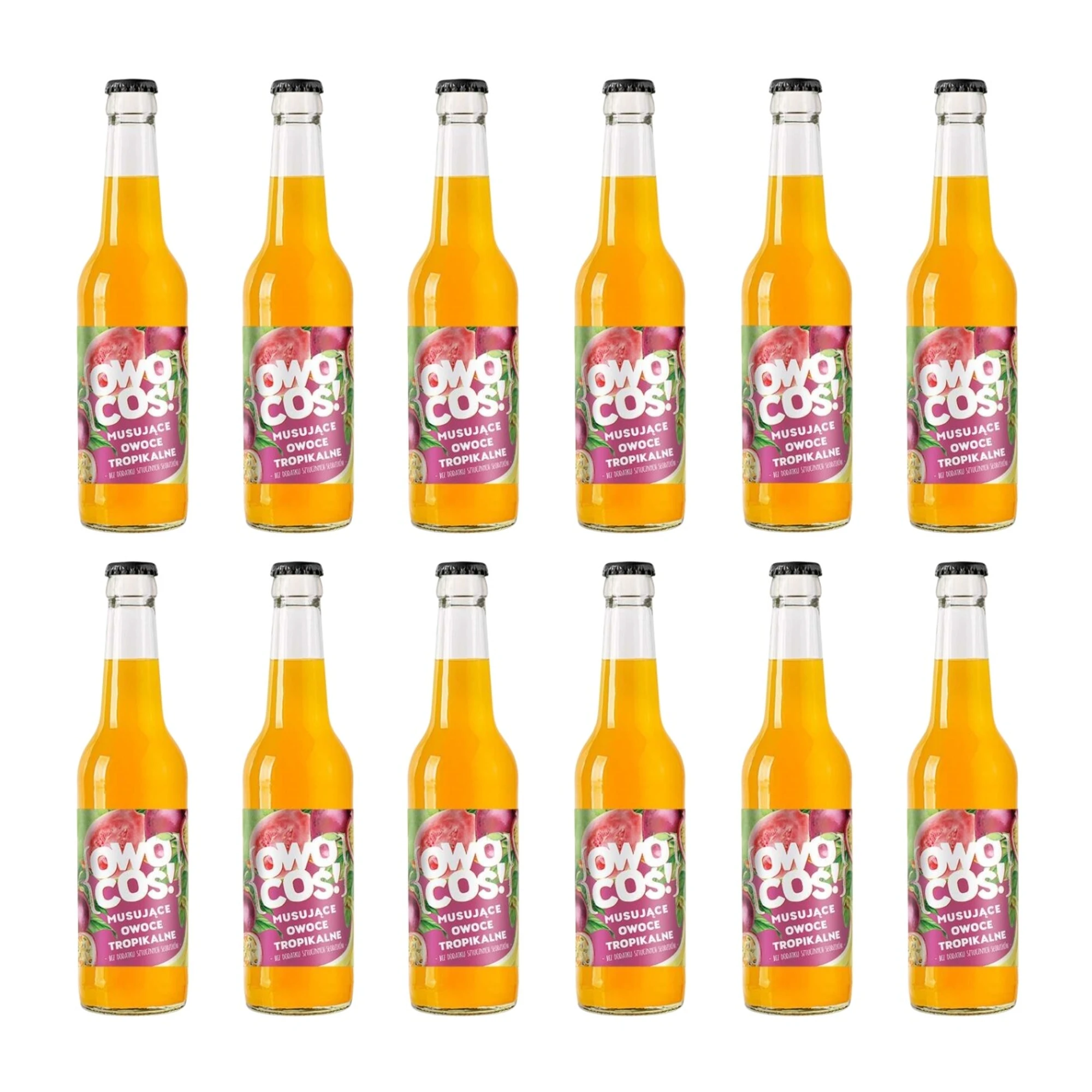 Owocoś owoce tropikalne, 12 szt., Owocowe Smaki. To idealna kompozycja naturalnych składników inspirowana słońcem i świeżością dalekich krajów. Smak mango, marakui, ananasa czy papai tworzy wyjątkowo lekką i orzeźwiającą mieszankę, która doskonale gasi pragnienie i pobudza zmysły. W zestawie znajdują się 12 butelek pełnych owocowej energii. Napój idealny do szkoły, pracy, na spacer lub relaks w domu.