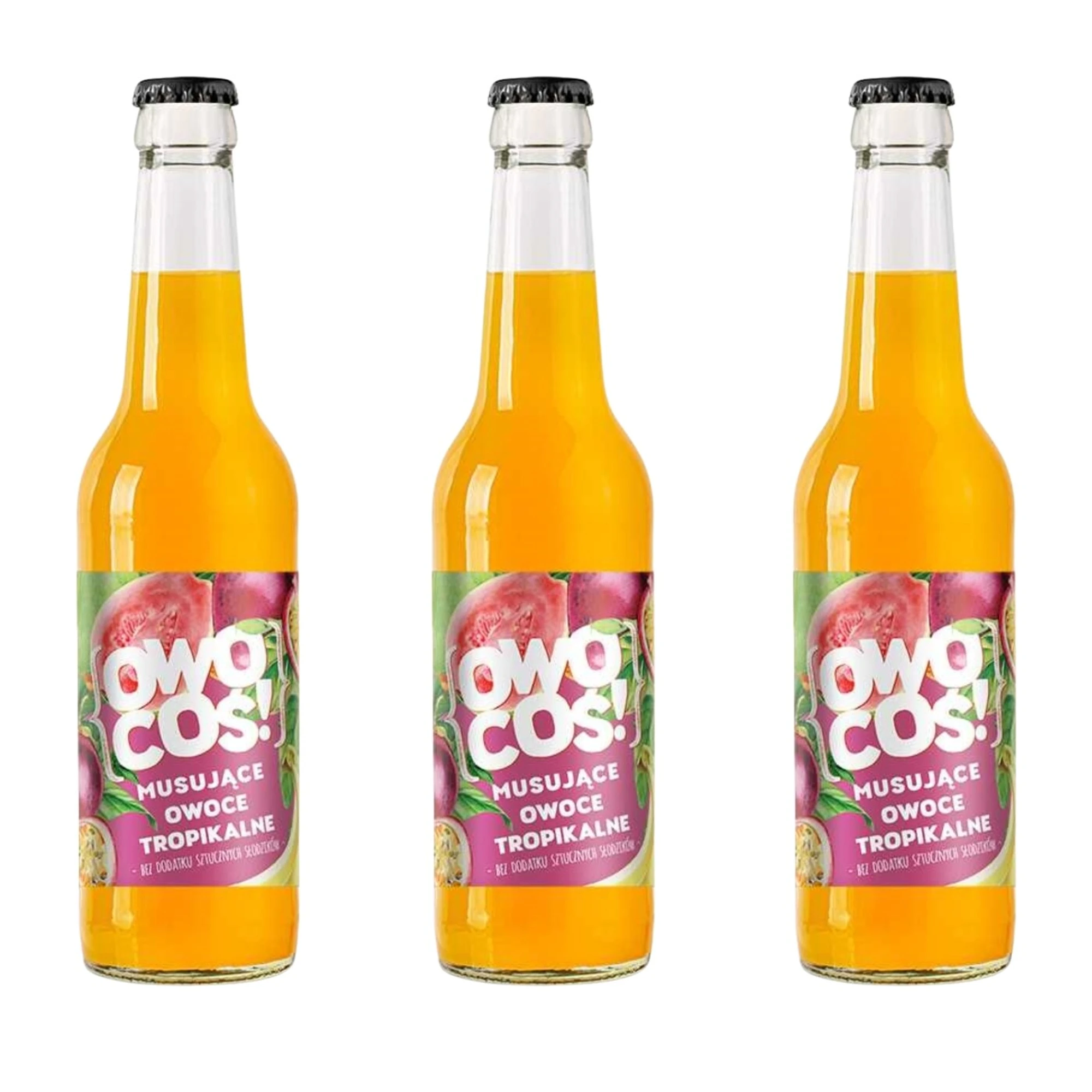 Owocoś owoce tropikalne, 3 szt., Owocowe Smaki to idealna kompozycja naturalnych składników inspirowana słońcem i świeżością dalekich krajów. Smak mango, marakui, ananasa czy papai tworzy wyjątkowo lekką i orzeźwiającą mieszankę, która doskonale gasi pragnienie i pobudza zmysły. W zestawie znajdują się trzy butelki pełne owocowej energii. Napój idealny do szkoły, pracy, na spacer lub relaks w domu.