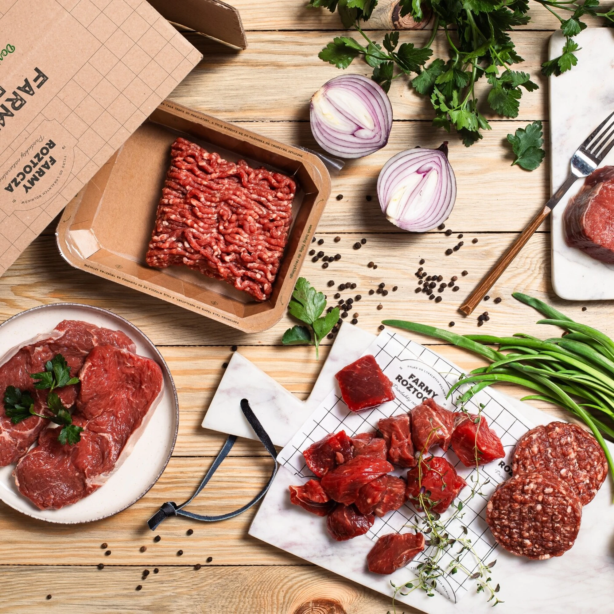 Paczka pełna ekologicznych mięs najwyższej jakości, pochodzących z lokalnych gospodarstw, które dbają o zdrowie zwierząt i środowisko. Pełne smaku mięso, wolne od sztucznych dodatków i hormonów.
