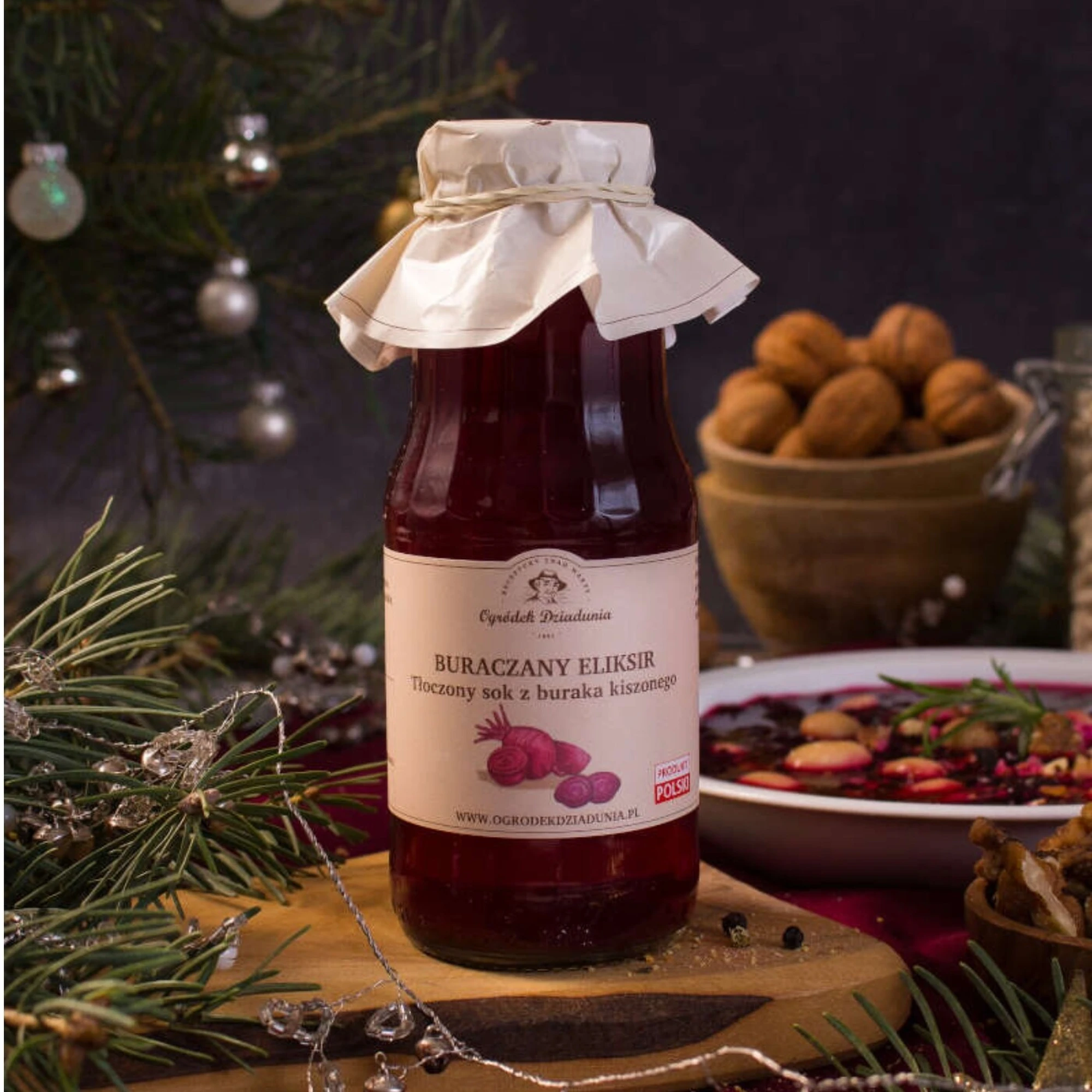 Sok z kiszonego buraka - Buraczany Eliksir to naturalny sok z kiszonego buraka, pełen cennych składników odżywczych i probiotyków wspierających odporność oraz prawidłowe funkcjonowanie organizmu. Powstaje w procesie naturalnej fermentacji, bez dodatku konserwantów, sztucznych barwników czy cukru. Jego głęboki, intensywny smak i lekko kwaskowa nuta sprawiają, że doskonale sprawdza się jako codzienny napój wzmacniający lub baza do zup i koktajli. Idealny dla osób dbających o zdrowie i naturalną dietę. Najlepiej smakuje schłodzony.