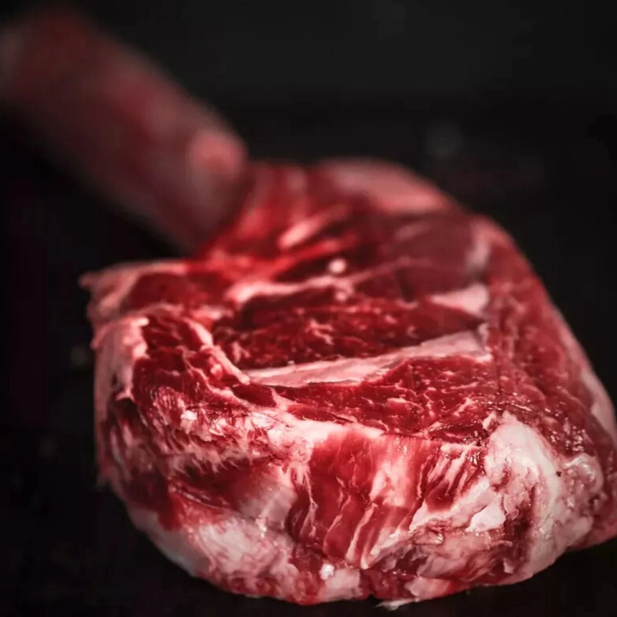 Gruba porcja soczystego antrykotu z kością, ręcznie wyselekcjonowana pod kątem marmurkowatości.
