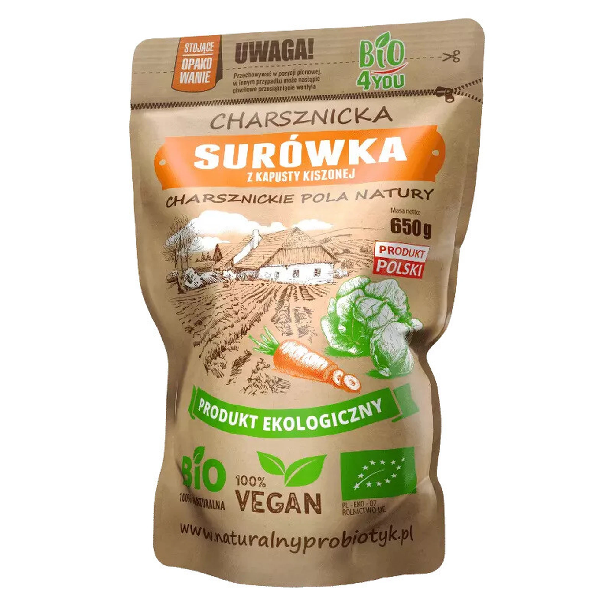 Surówka z kapusty kiszonej z marchewką Bio to naturalna kompozycja smaków, która łączy chrupiącą kapustę kiszoną z delikatną słodyczą marchewki. Powstaje wyłącznie z warzyw pochodzących z certyfikowanych upraw ekologicznych. Produkt nie jest pasteryzowany, nie zawiera żadnych konserwantów, regulatorów kwasowości ani przeciwutleniaczy. To gotowy, zdrowy dodatek do obiadu, który wzbogaci Twoje posiłki o cenne probiotyki i witaminy.