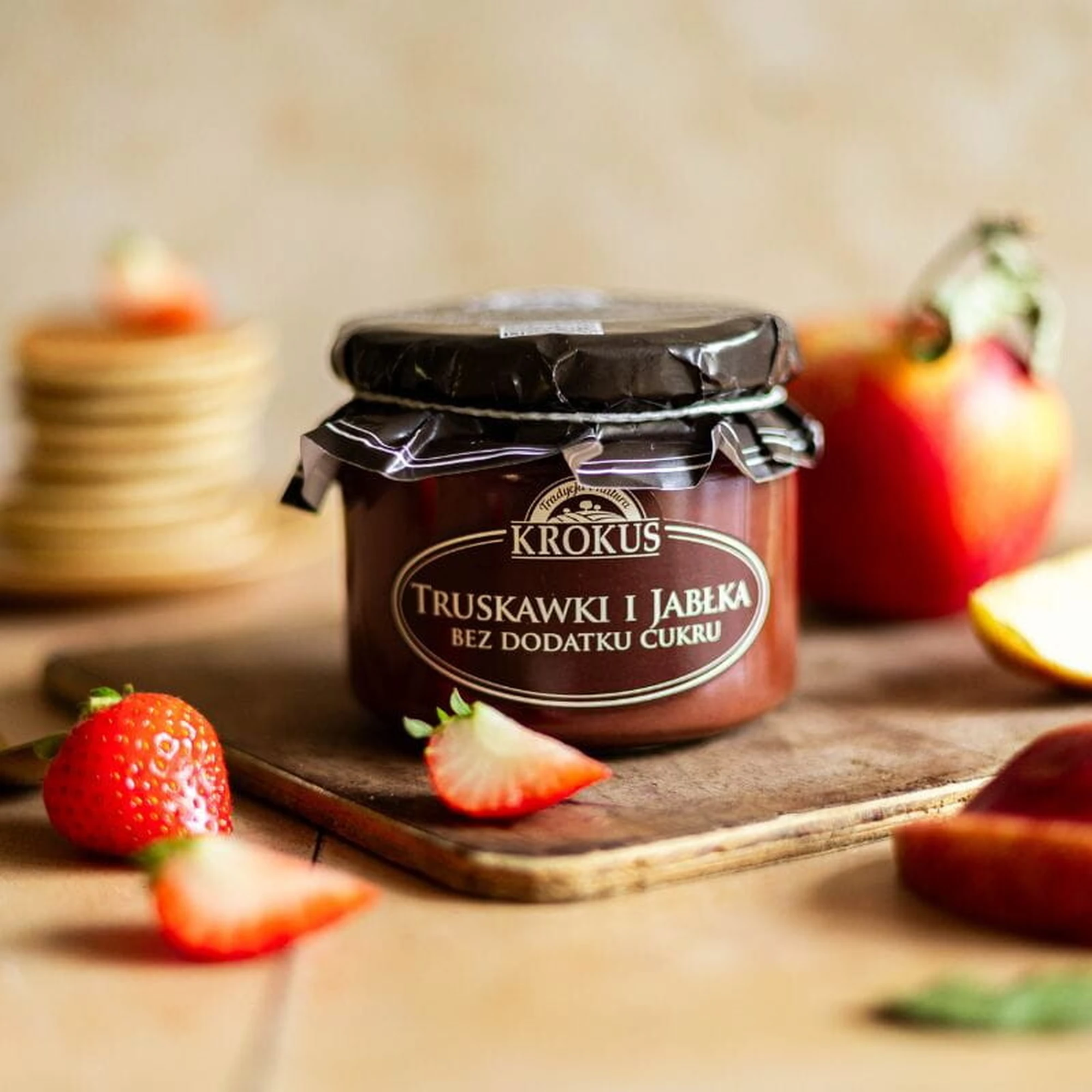 Truskawki i jabłka bez dodatku cukru to połączenie naturalnej słodyczy soczystych truskawek i delikatnej kwasowości jabłek. Dzięki starannej obróbce owoce zachowują pełnię smaku i aromatu, bez potrzeby dodawania cukru, konserwantów czy sztucznych substancji. To idealny dodatek do kanapek, naleśników, jogurtów, a także domowych deserów. Doskonałe dla osób, które dbają o zdrową dietę i cenią naturalne produkty.