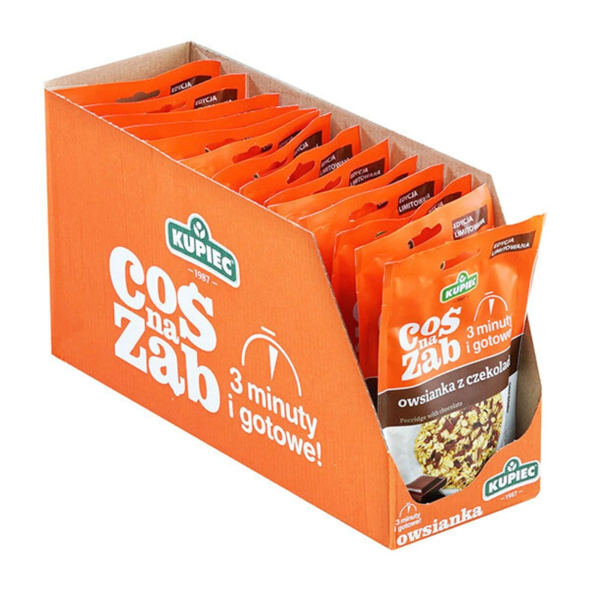 Owsianka z czekoladą to smaczny i pożywny produkt idealny na szybkie śniadanie lub przekąskę. Wykonana z wysokiej jakości płatków owsianych, wzbogacona delikatną czekoladą, dostarcza organizmowi błonnika, witamin z grupy B oraz minerałów takich jak magnez i żelazo. Owsianka jest źródłem energii, wspiera układ trawienny i pozwala na dłuższe uczucie sytości. Doskonale komponuje się z mlekiem, jogurtem, owocami czy orzechami, a także stanowi bazę do przygotowania deserów czy zdrowych batoników. Można ją także dodawać do ciast, muffinek lub smoothie, tworząc pyszne i zdrowe potrawy. Produkt jest idealny dla osób dbających o zdrową dietę i szybki posiłek w ciągu dnia.