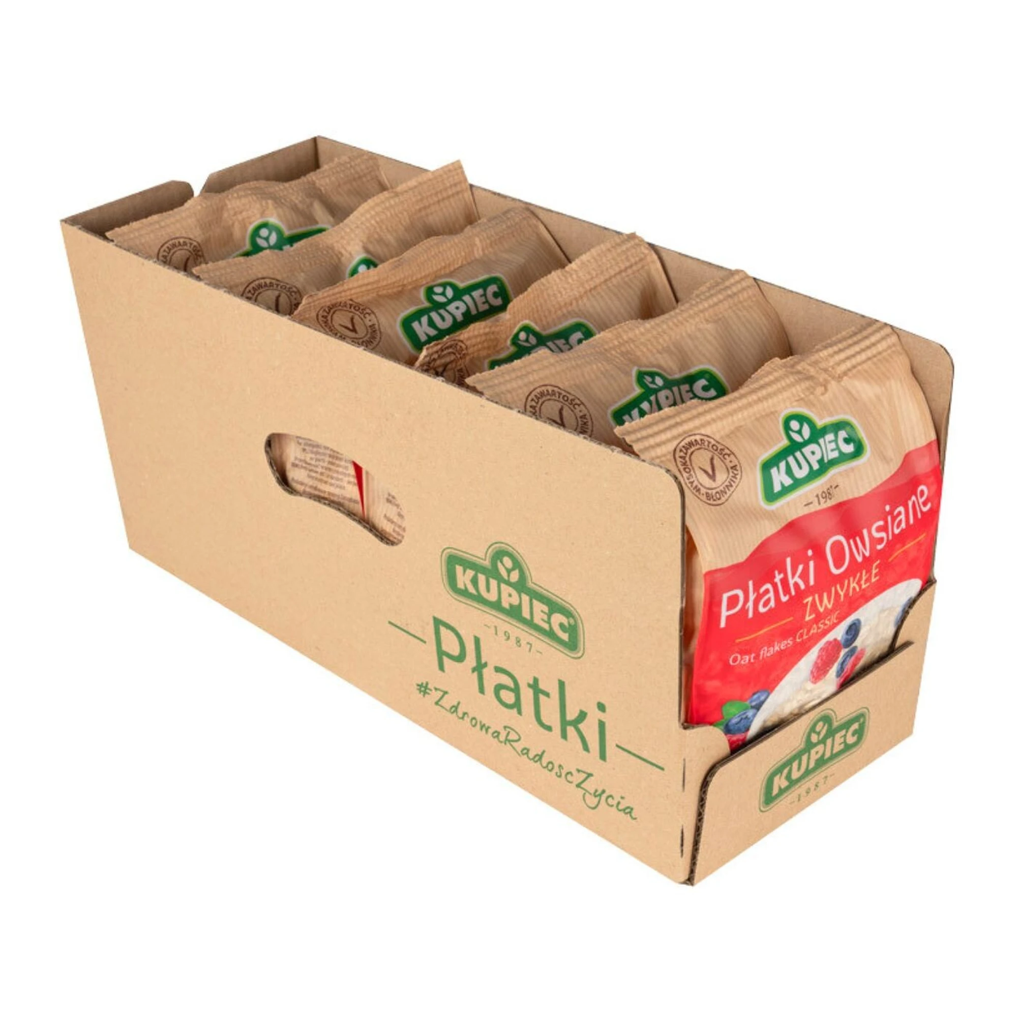 Płatki owsiane zwykłe to naturalny, bogaty w błonnik produkt, który doskonale wpisuje się w zdrową i zrównoważoną dietę. Stanowią doskonałe źródło witamin z grupy B, minerałów takich jak magnez, żelazo oraz składników odżywczych wspomagających trawienie i utrzymanie energii na wysokim poziomie. Płatki można spożywać tradycyjnie w postaci owsianki, zarówno na słodko, jak i wytrawnie, albo wykorzystać do przygotowania zdrowych, pełnoziarnistych ciasteczek. To uniwersalny składnik, który świetnie komponuje się z owocami, jogurtem, mlekiem roślinnym czy orzechami. Dzięki nim można stworzyć pełnowartościowe śniadanie, przekąskę do szkoły, pracy czy na wycieczkę. Wybierając płatki owsiane, inwestujesz w zdrowie i energię każdego dnia.