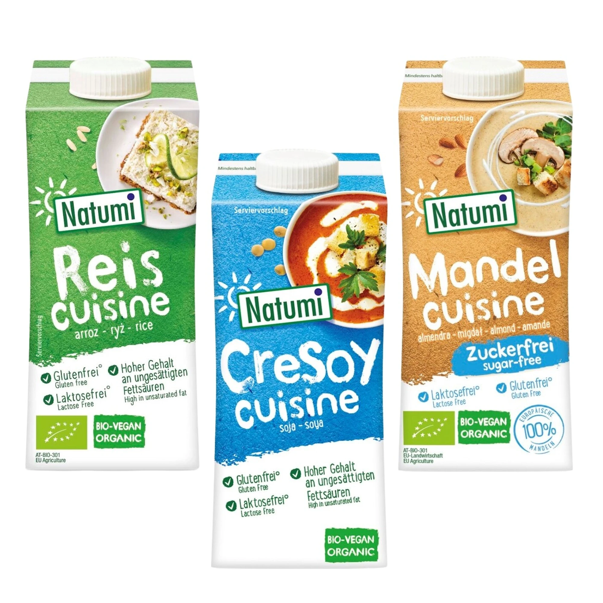 Zestaw kremów roślinnych: ryżowy, sojowy i migdałowy to zdrowe i wszechstronne alternatywy dla tradycyjnej śmietanki, stworzone z ekologicznych składników. Krem ryżowy charakteryzuje się delikatnym, neutralnym smakiem, sojowy ma aksamitną konsystencję, a migdałowy dodaje lekkiej, orzechowej nuty. Doskonałe do gotowania, pieczenia, deserów, kawy oraz dań kuchni roślinnej. Bez dodatku cukru, laktozy i glutenu – idealny wybór dla wegan oraz osób ceniących zdrową dietę.