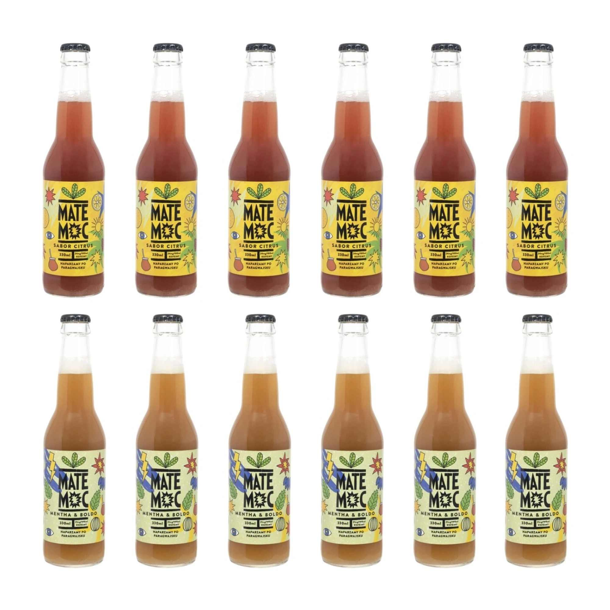 Zestaw Mate Moc: Sabor Citrus, Mentha & Boldo – orzeźwiające Sabor Citrus oraz ziołowe Mentha & Boldo. Każdy z napojów bazuje na yerba mate, naturalnym źródle kofeiny, które pobudza organizm bez sztucznych dodatków. Sabor Citrus zachwyca cytrusową świeżością, idealną na ciepłe dni, natomiast Mentha & Boldo to uspokajająca harmonia mięty i boldo z lekką goryczką. W zestawie znajdziesz 12 sztuk napojów – doskonałych do picia na zimno, w pracy, w podróży lub po treningu. Naturalna energia, wyrazisty smak i czysty skład zamknięte w każdej butelce.