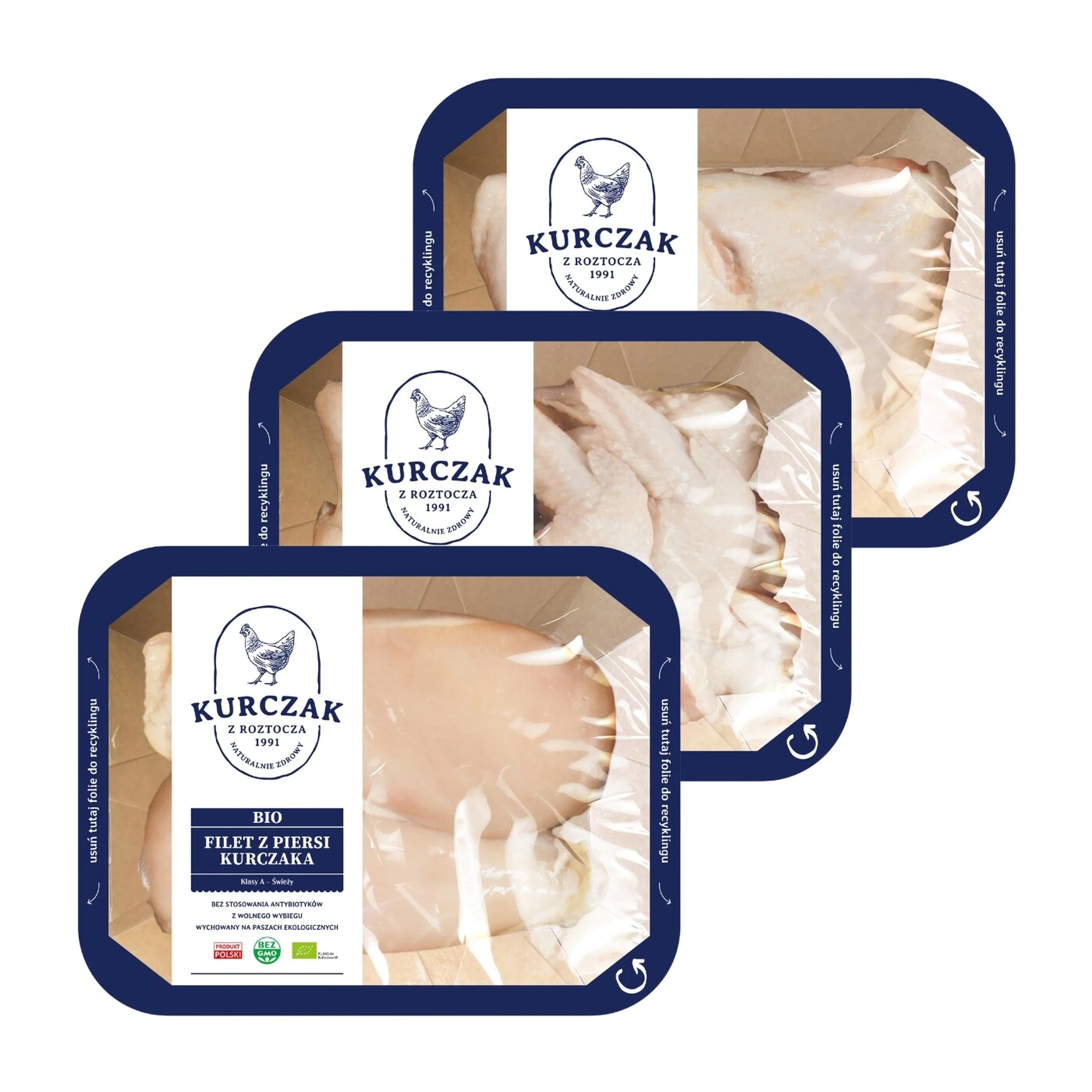 Zestaw mięsa BIO: filet z piersi kurczaka, skrzydełka i podudzia to idealna kompozycja ekologicznego drobiu dla całej rodziny. Filet z piersi jest chudy i delikatny – świetny do grillowania, sałatek lub smażenia. Skrzydełka i podudzia to klasyka kuchni domowej – soczyste, pełne smaku, doskonałe do pieczenia, duszenia czy na grilla. Mięso pochodzi z certyfikowanego chowu ekologicznego – bez antybiotyków, GMO i sztucznych dodatków.