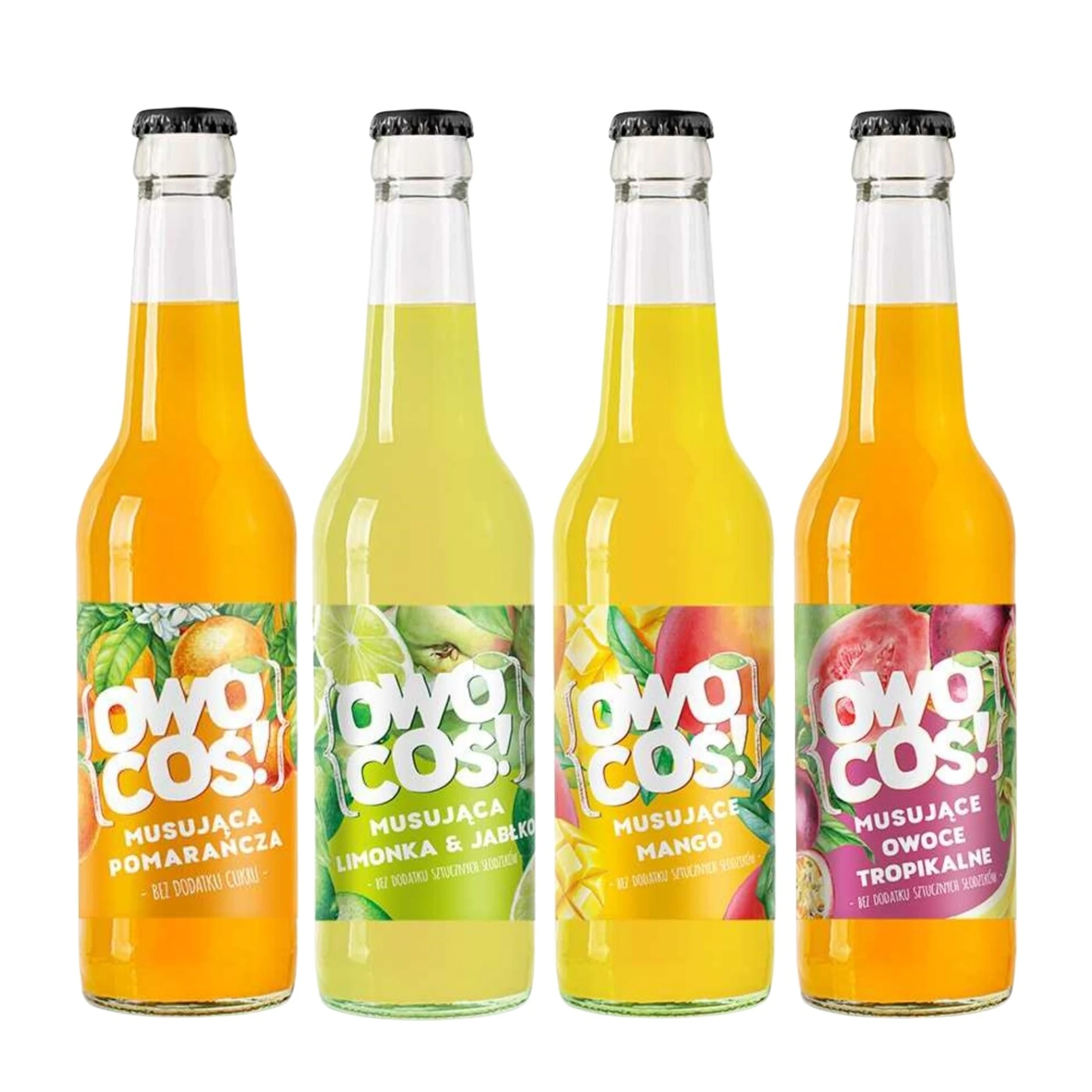 Zestaw napojów Owocoś, 4 szt., Owocowe Smaki – pomarańcza, limonka-jabłko, mango, owoce tropikalne