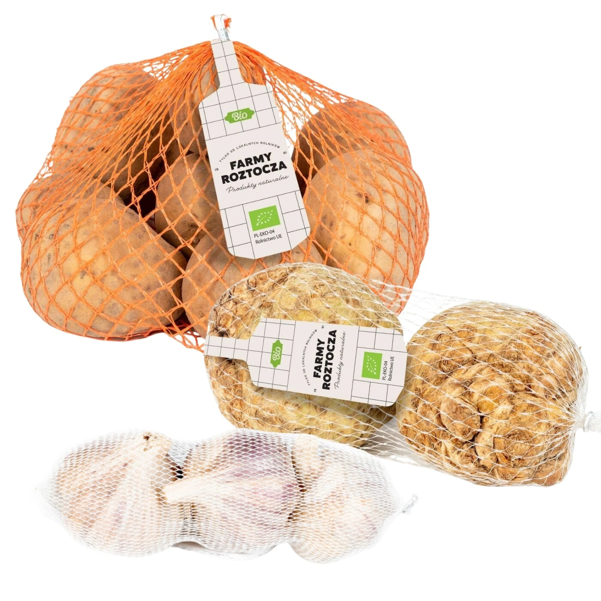 Zestaw warzyw BIO: ziemniaki, seler, czosnek to doskonały wybór dla osób ceniących naturalne składniki najwyższej jakości. Warzywa pochodzą z ekologicznych upraw, co gwarantuje ich intensywny smak i bogactwo wartości odżywczych. Ziemniaki to uniwersalna baza wielu dań, dostarczają witaminę C oraz składniki mineralne, takie jak potas. Seler wzbogaci potrawy głębokim aromatem, jest bogaty w witaminy z grupy B oraz witaminę K, a także zawiera antyoksydanty, które wspierają zdrowie serca i układu pokarmowego. Czosnek doda wyrazistego smaku, ma właściwości przeciwbakteryjne i przeciwzapalne, dzięki zawartości allicyny. Idealny zestaw do domowych zup, puree, pieczeni oraz innych tradycyjnych i nowoczesnych potraw.
