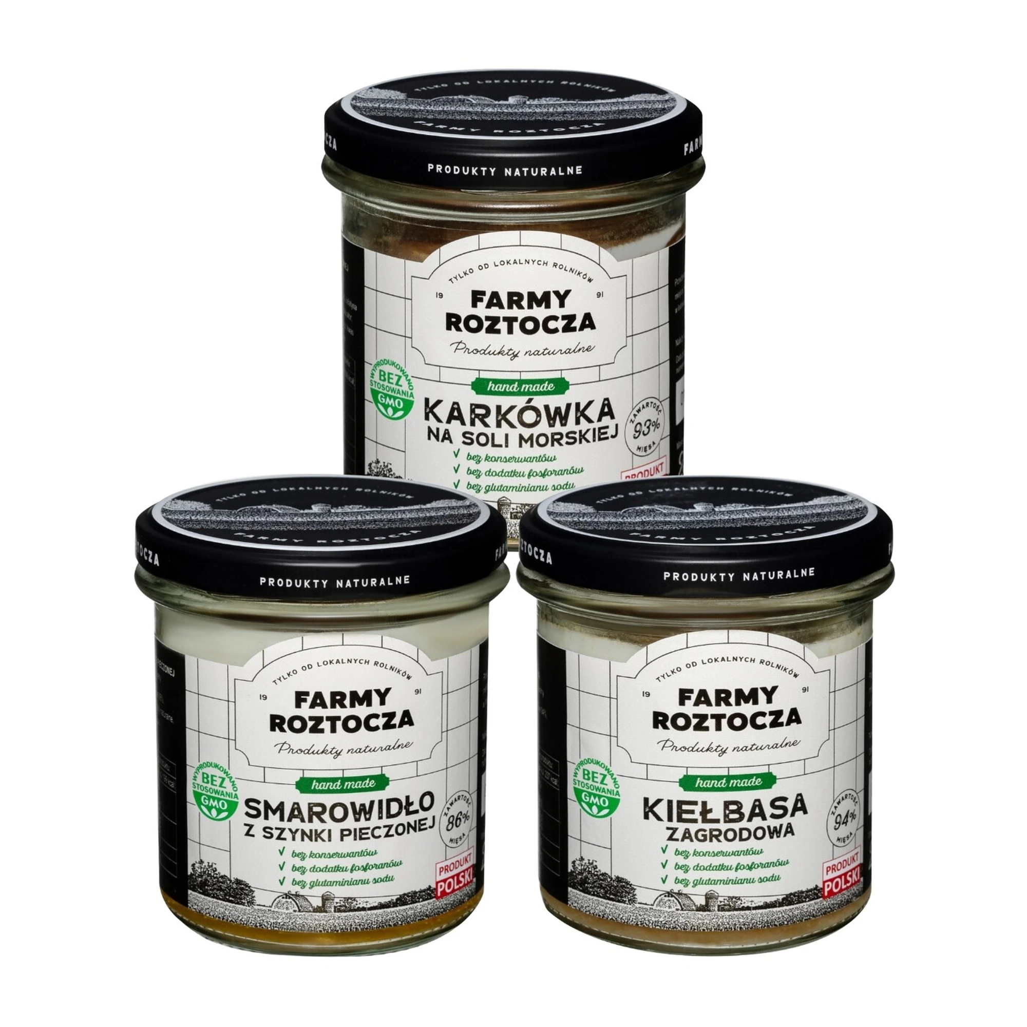 Zestaw wyrobów mięsnych w słoiku to doskonała propozycja dla miłośników tradycyjnych smaków zamkniętych w wygodnej formie. W skład zestawu wchodzi smarowidło z szynki pieczonej o delikatnej konsystencji i intensywnym, mięsnym smaku, aromatyczna kiełbasa zagrodowa przygotowana według rzemieślniczej receptury oraz soczysta karkówka na soli morskiej, która zachwyca naturalnością i wyrazistością. To idealny wybór na kanapki, przystawki czy przekąski w podróży. Produkty są zamknięte w słoikach, co pozwala dłużej zachować ich świeżość i smak bez konieczności użycia konserwantów.
