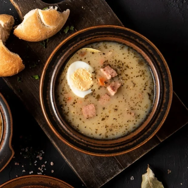 Tradycyjna, lekko kwaśna zupa przygotowywana z naturalnego zakwasu.