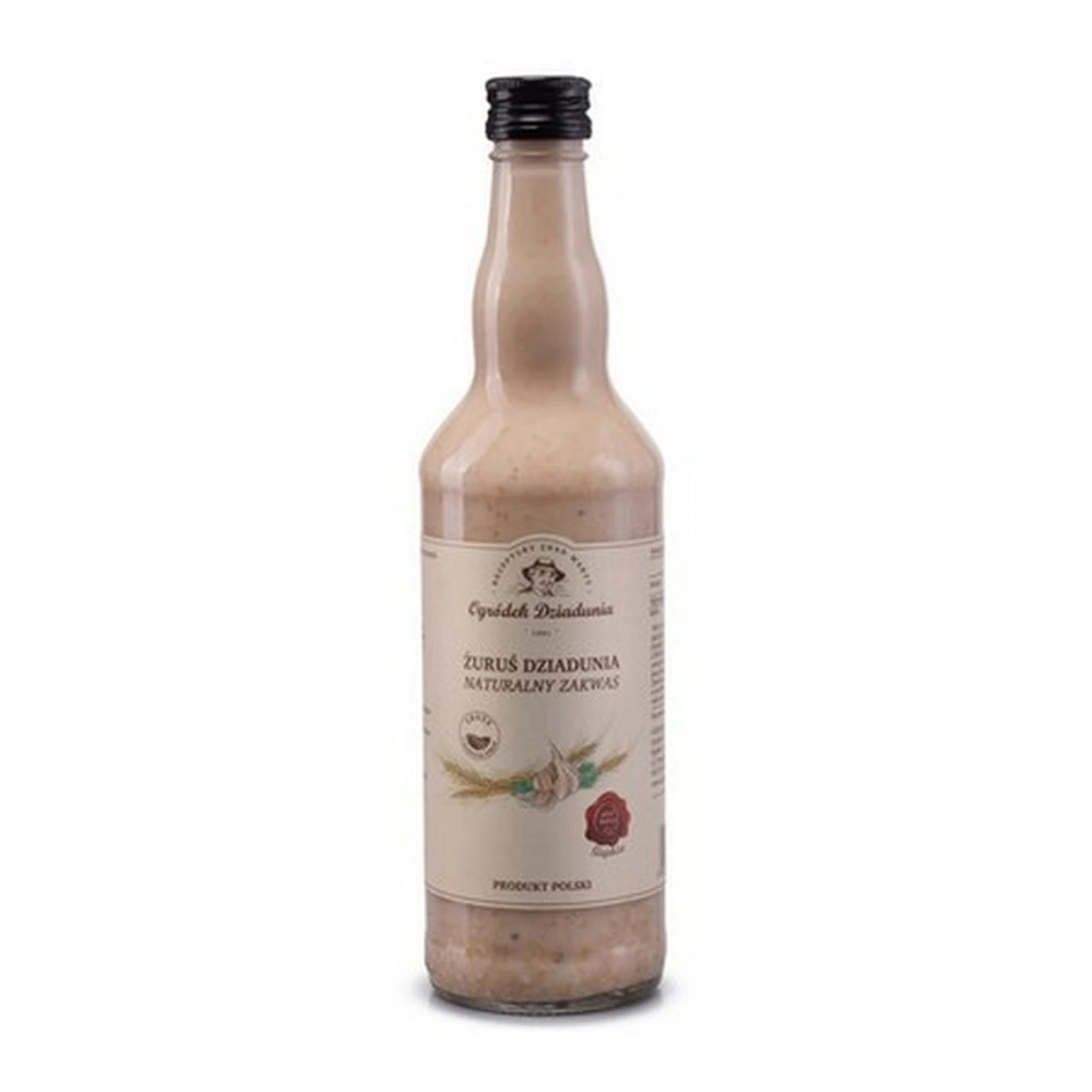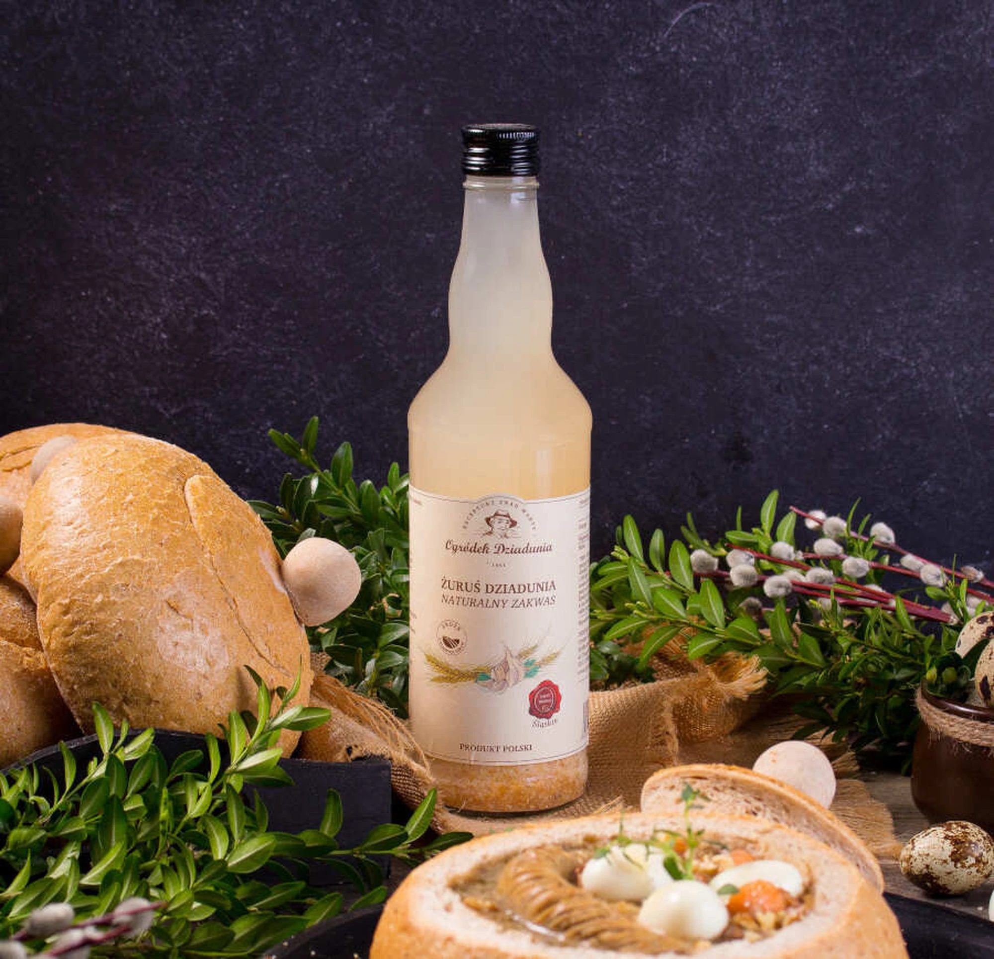 Żuruś Dziadunia - zakwas przygotowywany według tradycyjnej receptury. Bez konserwantów i sztucznych dodatków, wyróżnia się autentycznym smakiem. Idealny do wielkanocnego żurku, zalewajki czy żuru z kiełbasą. Jedna butelka wystarcza na aż 4 litry zupy.