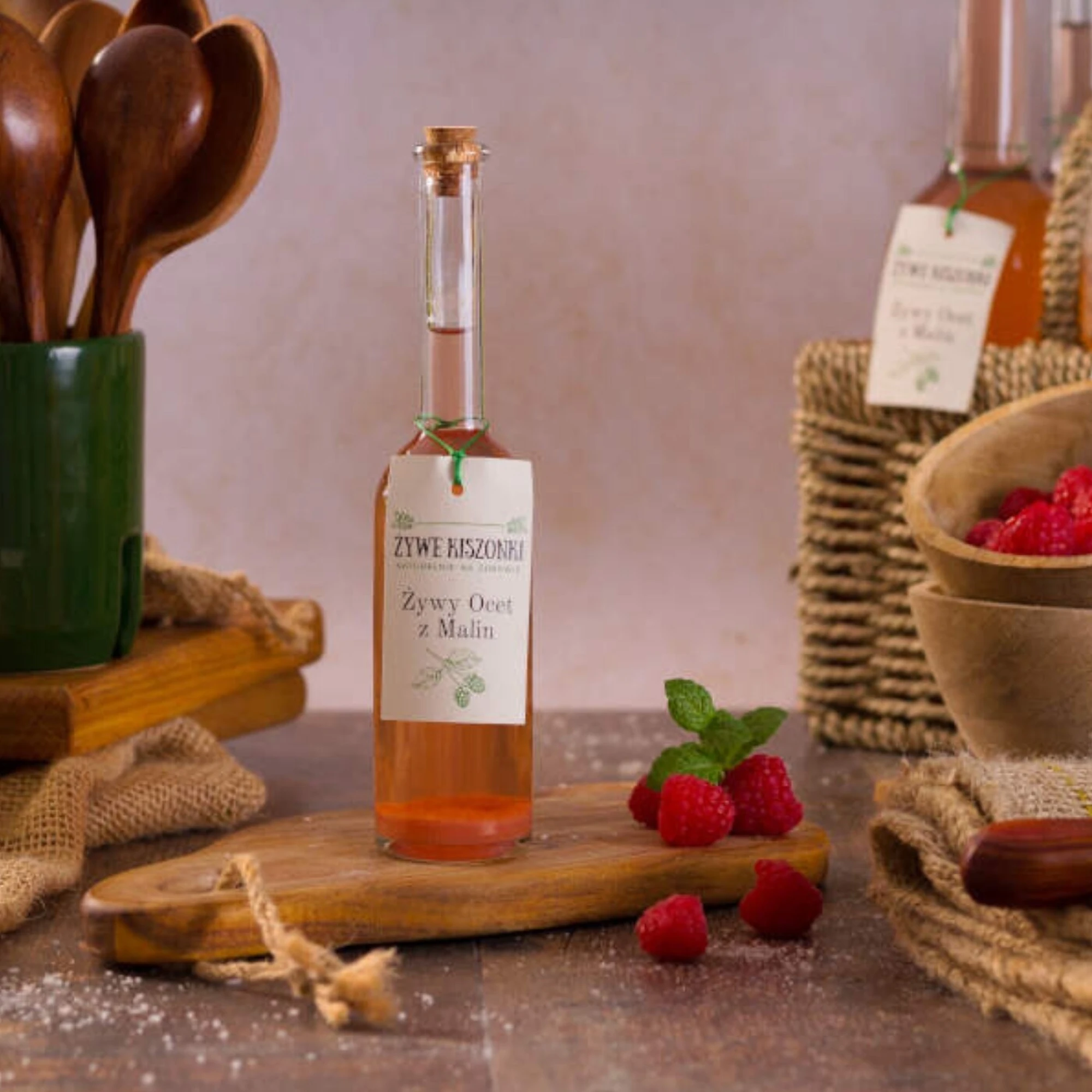 Żywy ocet malinowy powstaje w wyniku powolnej fermentacji bez użycia konserwantów i sztucznych dodatków. Tworzony na bazie krystalicznie czystej wody ze źródeł jurajskich oraz aromatycznych, polskich malin pochodzących z lokalnych upraw, zachowuje pełnię smaku i wartości odżywczych.Dzięki tradycyjnemu procesowi fermentacji, ocet żywy malinowy zawiera cenne enzymy, kwasy organiczne oraz naturalne składniki bioaktywne. Jego intensywny, owocowy smak i aromat czynią go wyjątkowym dodatkiem do codziennej diety. Świetnie sprawdzi się jako składnik dressingów, marynat, napojów czy zdrowych koktajli. Można go również rozcieńczać z wodą i spożywać jako naturalny tonik. Jego delikatnie słodko-kwaśny smak doskonale komponuje się zarówno z potrawami słodkimi, jak i wytrawnymi.